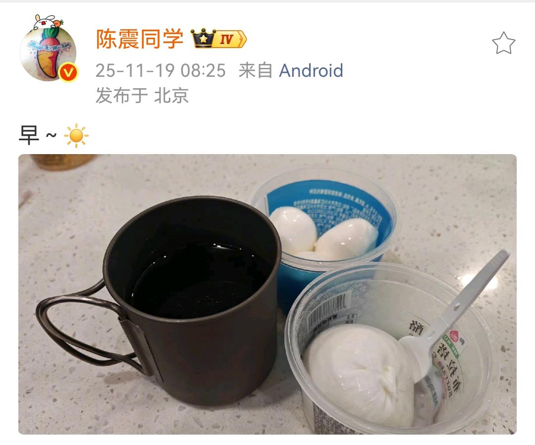 陈震:早~☀️ 陈震同学的早饭还是一如既往的简单,他每次早上会向各位网友发一张图片,这代表着一天的开始。 当别的自媒体博主还在想方设法增加流量的时候,陈震每天至少可以多发三条内容,分别是早上吃饭,早上出门,晚上炫肉。 各位是怎么看的?欢迎评论区留言。