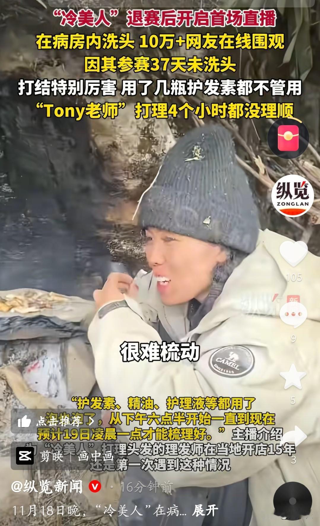 这姐们参加荒野求生赛37天没洗头,头发缠得跟“钢丝球”似的,混着石砂硬邦邦,自己梳不开,几瓶护发素都救不活。 好在有好心Tony老师主动上门,带着家伙事儿直奔病房,光理顺就折腾了4小时。直播里她还一个劲儿喊“没有虱子没有虱子”,把网友逗得不行。 虽说现在头发还没完全弄好,但总算从“打结灾难现场”里拔出来了。网友们一边心疼她比赛遭的罪,一边蹲守直播等后续——这头发要是能救回来,高低得算“发型界的奇迹”了!