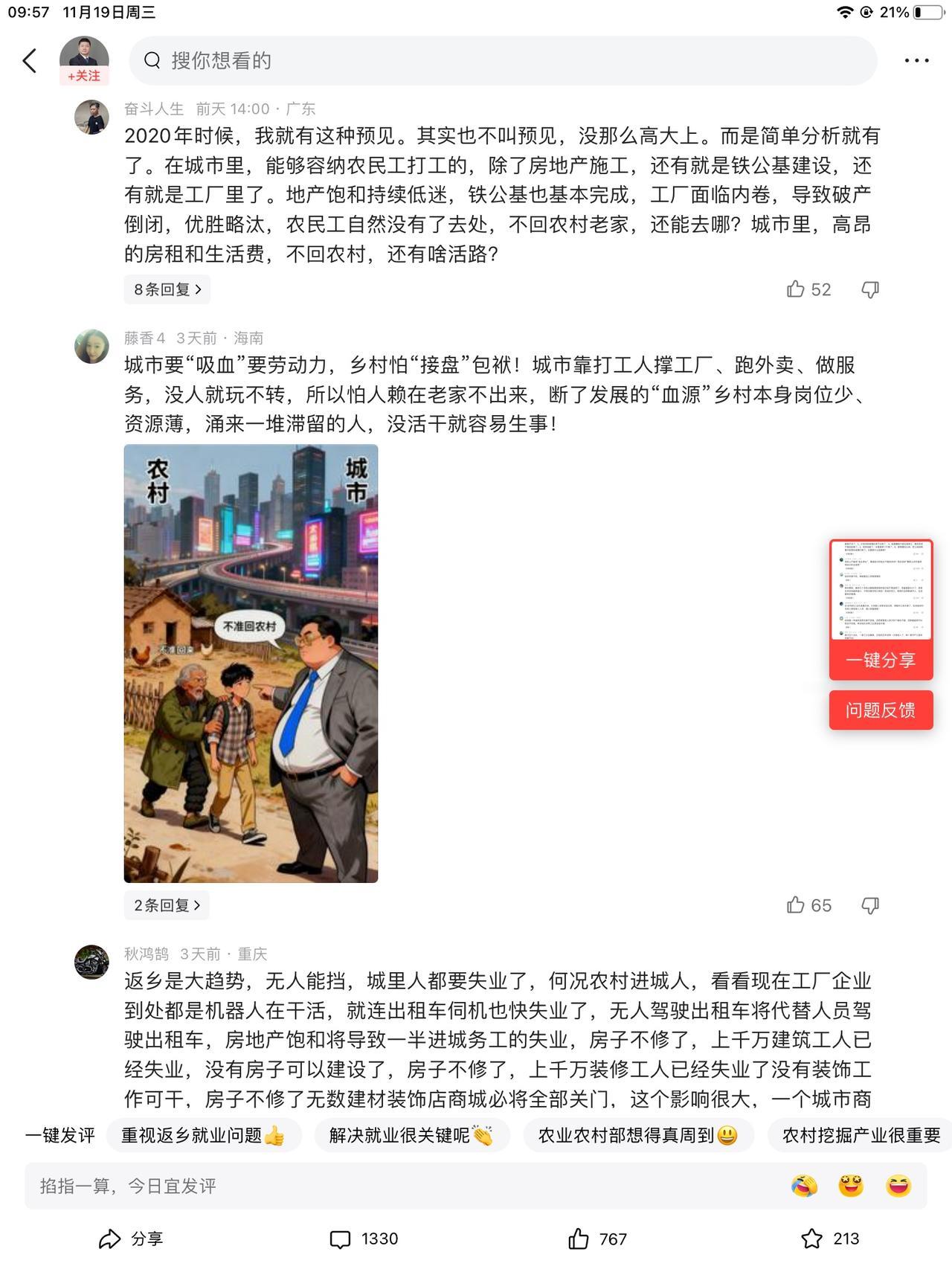 防止规模性返乡滞乡,一看标题,我破防了。框框一顿输出,无意外,被禁止推流了。冷静之下,我坐下来了。 又看到杜华:说王一博。13岁跟着她,捧红了,多年以后合同到期,人家出去了。她说她是冰冷的,身体发麻。 是有情感上的不舍,也有财神爷跑了的愤怒和无奈。,有能力了,你就有的选。像王一博。没能力了,就没得选,每一步,都是被动的。像农民工的我们。城市容不下肉身,农村回不去的家乡。很快,机器人替代了大部分的劳动力。 城里人,有能力的城里人,他都不屑于收割我了,他忙着去收割机器人了。机器人,只耗点电,很便宜。我呢,费钱,还会请假,还会出错。还会老,还要保险。我太贵了,这么一算。我应该被淘汰。 大强子说,未来,一周只工作一个小时,他喜笑颜开,但是他没说,这一个小时,是按照日结,还是周结,给我算多少薪水,我不工作的,那几十个小时,我去哪里工作? 我担心的还是来了。我活不起了。