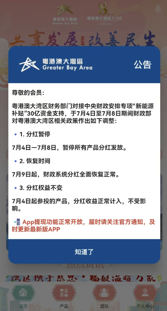 【大湾区政策红利发放?财政部声明:不法分子伪造公文诱导投资】11月18日,财政部金融司发布声明称,近期,有不法分子伪造财政部公文,在社交媒体上传播“粤港澳大湾区政策红利发放”有关虚假信息,诱导网民下载“粤港澳大湾区App”“共建大湾区App”进行投资。对此,财政部金融司表示,从未发布过“推行‘离岸钱包’及‘香港汇丰银行’用于粤港澳大湾区政策红利发放”“支持粤港澳大湾区发展加强区域金融合作释放财政补贴”“推行粤港澳大湾区金融债券”等相关政策文件。请广大网民提高警惕,谨防上当受骗。记者留意到,此前有网友在社交平台发布过“粤港澳大湾区App”在今年7月曾发布分红暂停的公告。此外,也有不少网友反映该App出现多次拖欠分红的情况。