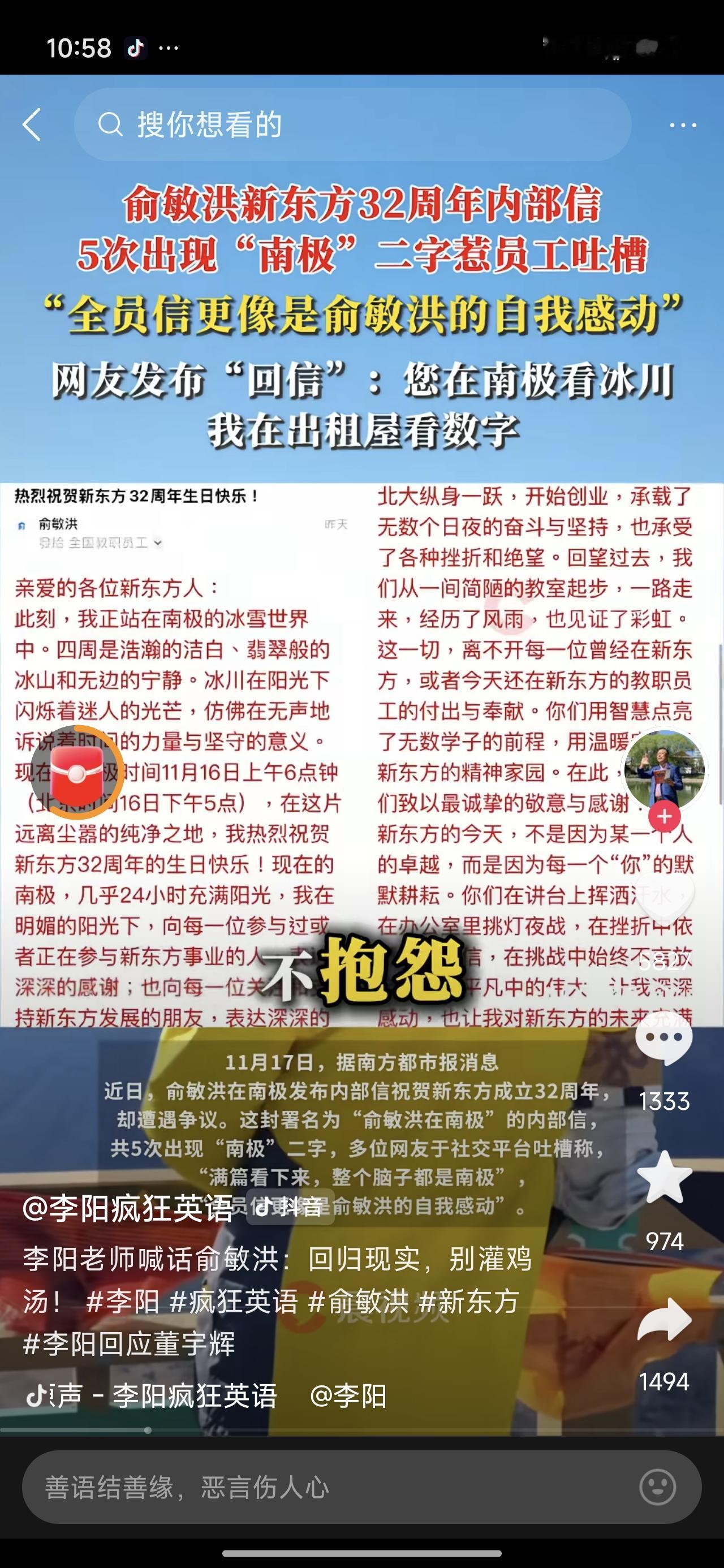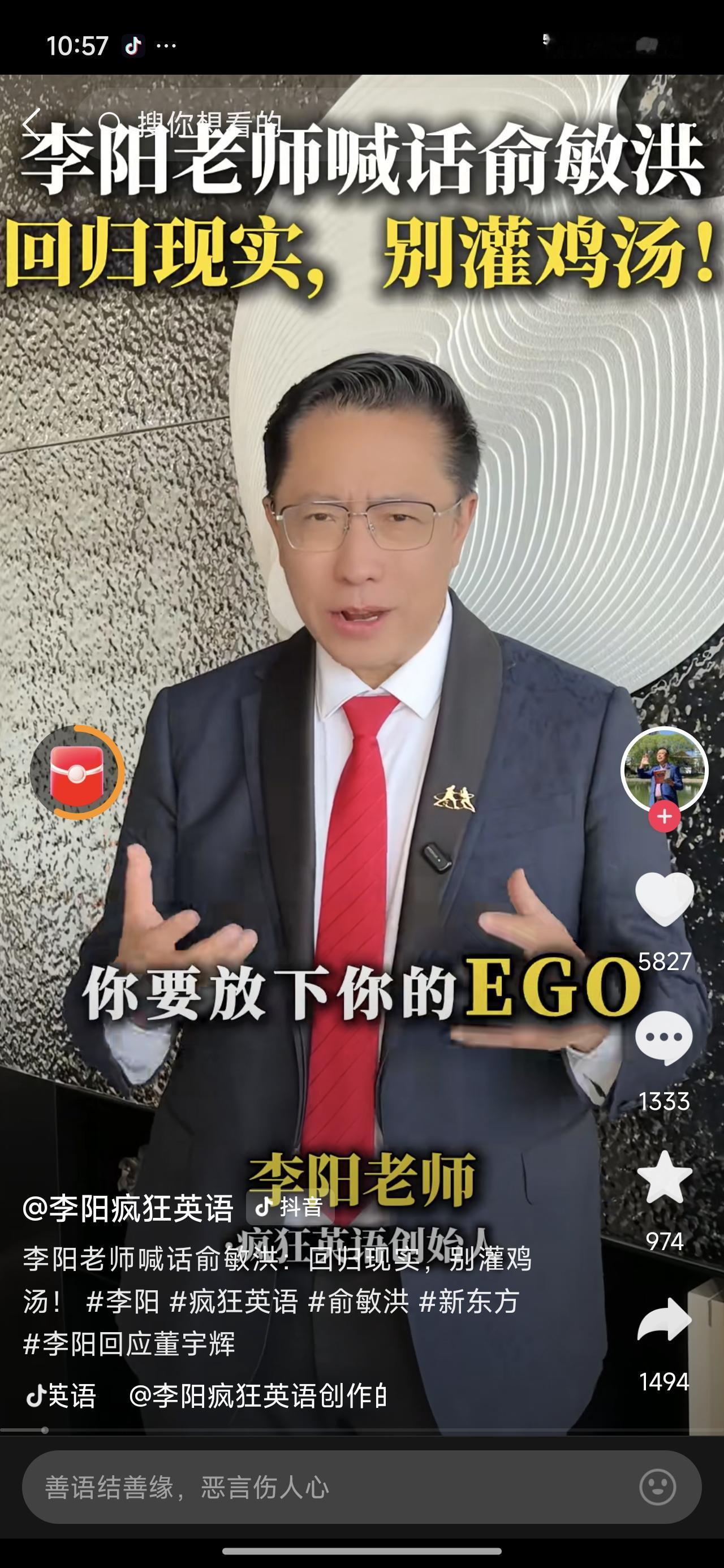 李阳太聪明了!终于找到了自己的赛道!喷俞敏洪!笑不活了。 他说他是他的老朋友了,真的是太二了。这话你李阳要是早这么说,你能白白挨了这么多天的骂吗? 你小子,还是狠聪明的呐?不是不允许你批评董宇辉,你嘴轻点喷,人家干的都是正事儿,带领很多人卖出了产品,增加了收入。这都是好事,是福报。 你多看看多听听大众怎么想的,不要现在人民的对立面。虽然老板跟员工想的不可能一样,但老板喝咖啡看企鹅,能不能小点声?我还加班没有加班费,还祝我快乐,我快乐个屁,他不祝我,我不搭理他,他一旦空话连篇,我希望他冻死在南极,并且就地掩埋,别回来恶心我了。