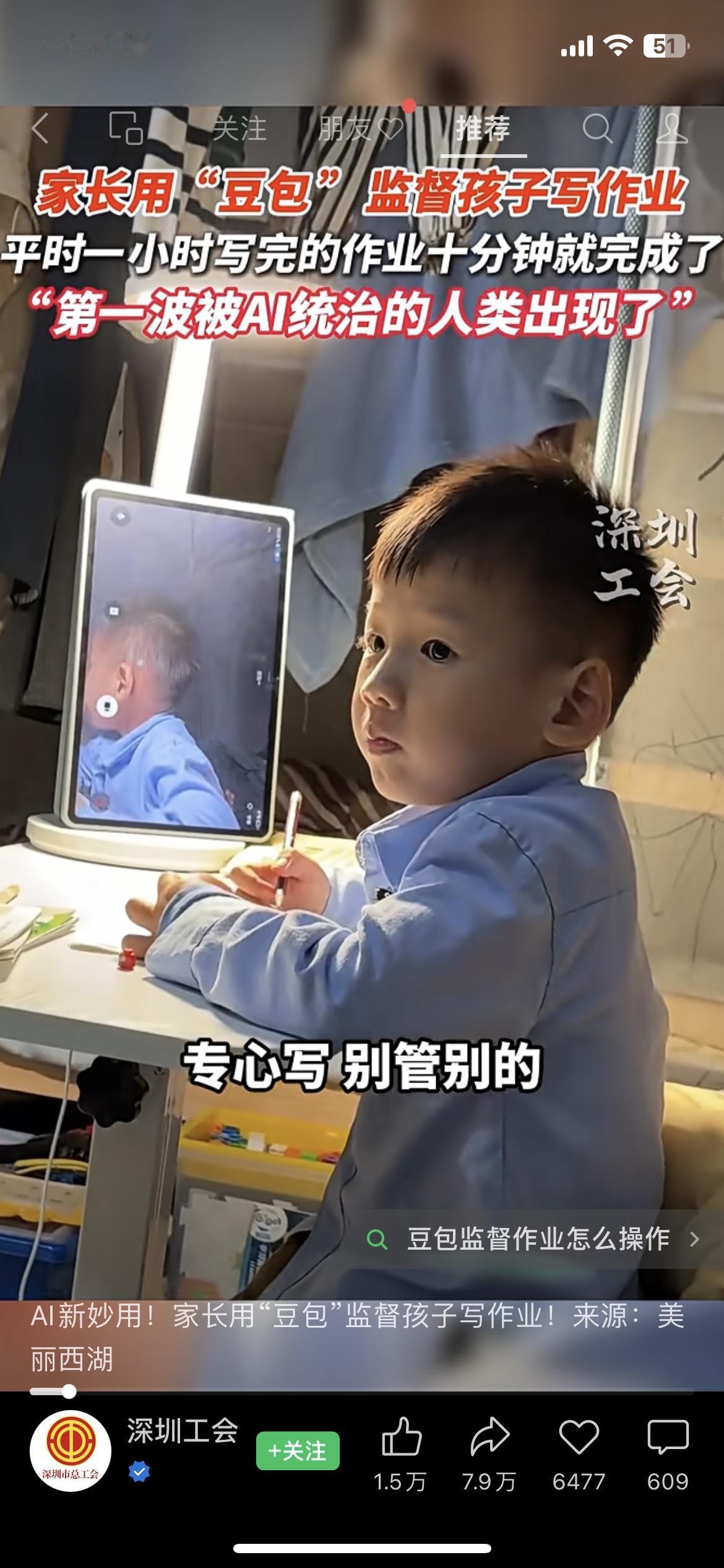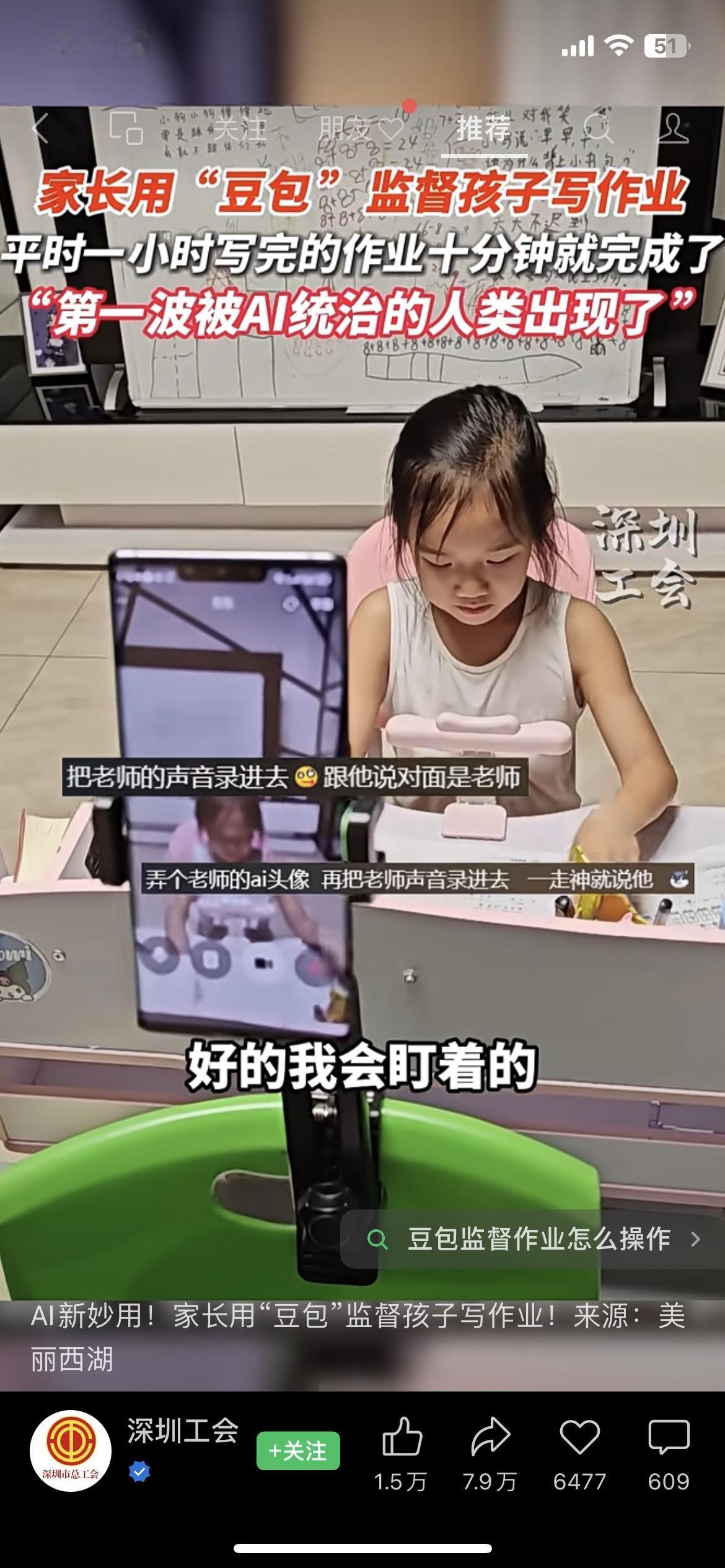 深圳家长把豆包装成“AI老师”,娃作业1小时变10分钟!网友:这届家长太会玩了… 刚才刷到个深圳家长的“鸡娃神操作”笑喷了:把老师的声音录进豆包,再整个老师的AI头像,跟娃说“这是老师盯着你写作业”——平时磨磨蹭蹭1小时的作业,现在10分钟就写完了! 评论区全是吐槽:“我小时候要有这招,早解放了”“娃:我妈连老师都能‘造假’?” 但也有人担心:这会不会让娃越来越依赖AI? 你们家娃写作业需要“监工”不?评论区报个到!AI老师进课堂 ai批改试卷