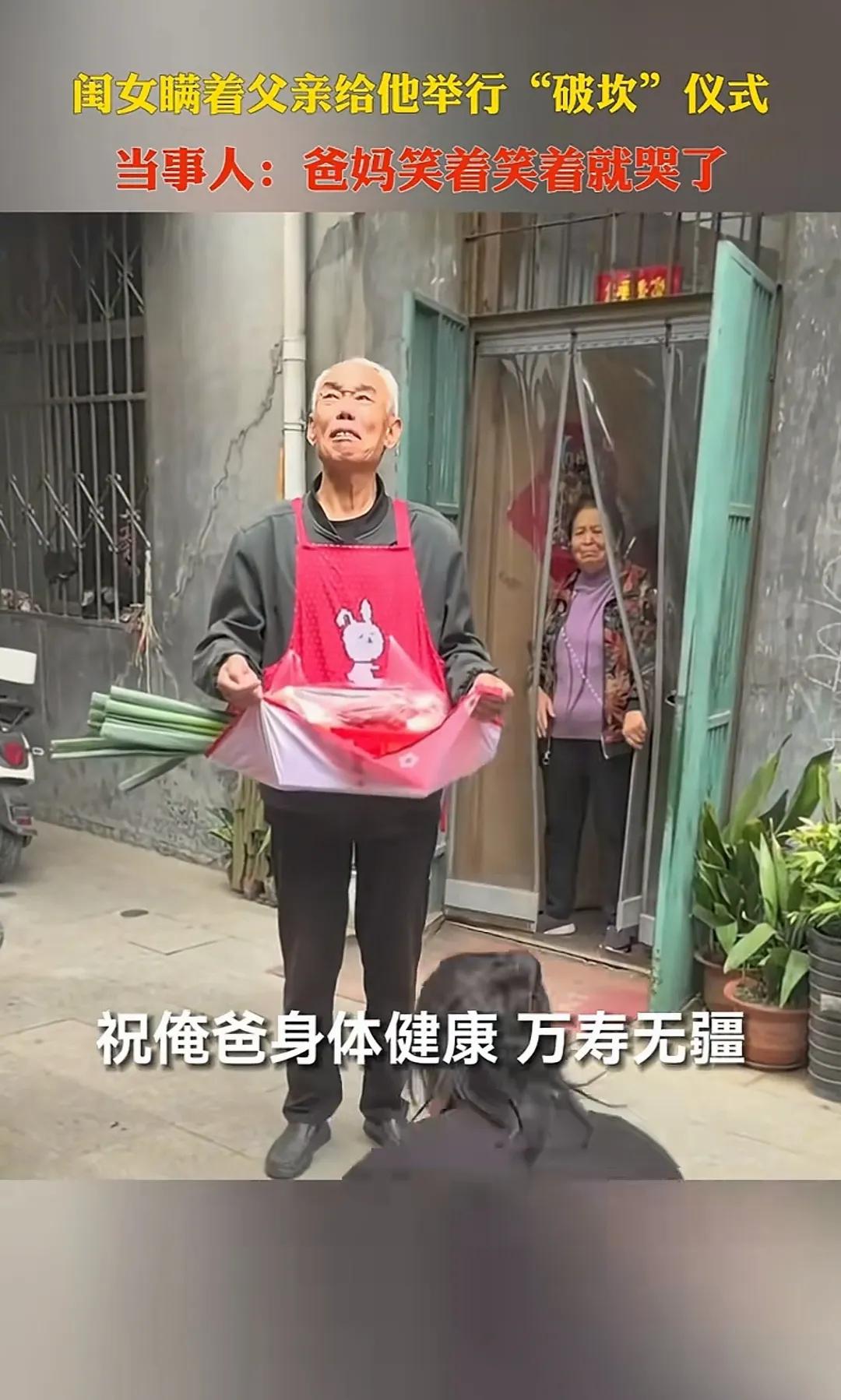 泪奔!24年10月31日报道河南新乡,一女子给73岁父亲举行“破坎”仪式,买来了一捆葱,一瓶酒,一条鲤鱼,一块肉,一个红包,边做动作边念词,老父亲高兴得不得了,可当女子做最后一个动作时,父母笑着笑着却哭了![黑线] 一位女子为73岁父亲举办传统“破坎”仪式的视频走红网络,没有隆重宴会,仅用一捆葱,一瓶酒、一条鲤鱼,一块肉和一个红包,这些寻常物品组合成了最温暖的祝福。 她为父亲系上红围裙,将每样物品轻轻放进父亲身前的围裙中,伴着吉祥话,“先扔葱后扔酒,一冲冲到九十九”“买条鲤鱼窜一窜,一窜窜到一百三”,老人听着祝福,笑容越来越浓。 最动人的是仪式尾声女儿向父亲郑重叩首,这个动作让始终微笑的父亲瞬间落泪,无需言语的告白,胜过千言万语。 “破坎”习俗在我国多地流传,核心都是子女对父母健康长寿的期盼,这些仪式将美好愿望具象化,比如葱喻智慧,酒表长久,鲤鱼象征活力,在快节奏生活中,这种仪式感让亲情表达更加鲜明。 父亲从开怀到落泪的情绪变化,女儿每个动作中自然流露的敬爱,展现了中国家庭含蓄深沉的情感表达,这种真实互动,比任何华丽形式都更能触动人心。 当子女通过具体行动为父母祈福时,不仅缓解了老人对年龄的焦虑,更强化了家庭情感联结,这种代际间的情感流动,切实提升了老年人的幸福感。 陪父母吃顿饭,耐心听他们唠叨,这些日常小事同样能传递深厚情感,孝道就在生活的细水长流里。 女儿这一跪,把人眼泪跪出来了。 “我也是新乡人,我们这儿确实有这个讲究,看到这个视频瞬间想我爹了,他今年也快到这个年纪了,到时候我一定也得给他好好办一个,啥都比不上儿女的这份心啊。” “孝心不是给多少钱,而是这份用心,女儿做的每个步骤,说的每句吉祥话,都装满了对父亲的爱,老爷子这眼泪,是幸福的眼泪。” “我们山东老家是‘六十六,吃闺女一刀肉’,到七十三也有说法,各地风俗不一样,但心意都是相通的就是希望老人健康长寿,为这个孝顺闺女点赞。” “简简单单,却情意深重,这让我想起我奶奶过寿时,我们一大家子人围在一起吃面的场景,真正的孝顺就藏在这些日常的仪式感里,不是做给谁看,而是发自内心的敬爱。” “一捆葱,一条鱼,物轻情意重,父亲的笑与泪说明了一切,这种代代相传的孝道文化,是我们最宝贵的财富。” “作为90后,以前觉得这些老规矩有点过时,但现在看了,反而觉得很受触动,这是一种情感的正式表达,比发红包,买礼物更有温度,以后也要多跟长辈学学这些老传统。” 在你的老家,有没有为长辈祝寿或祈福的特别习俗呢?您认为在当下,我们年轻人该如何更好地传承这份充满温情的“孝心仪式”? 信源:中国青年报