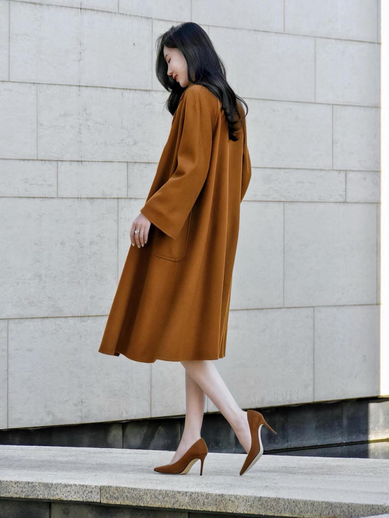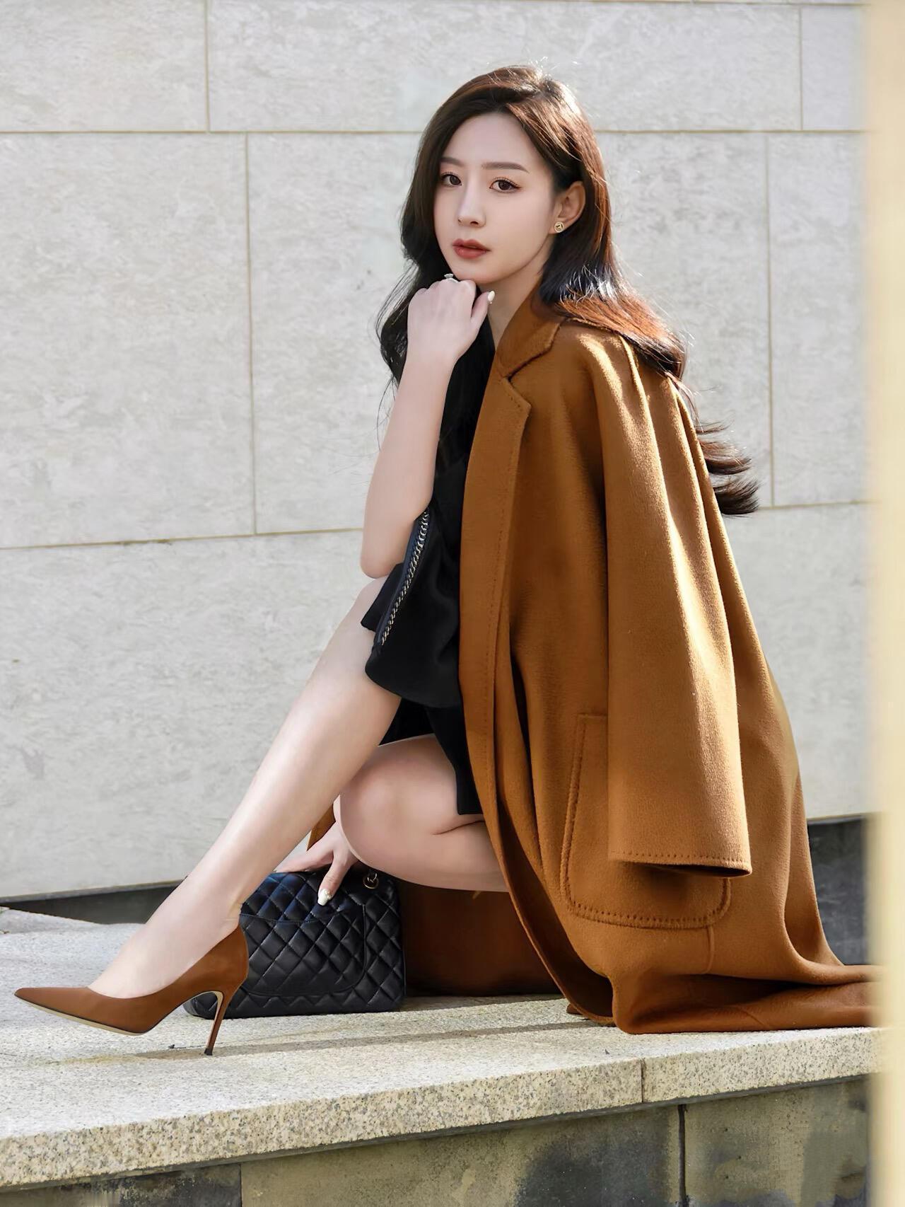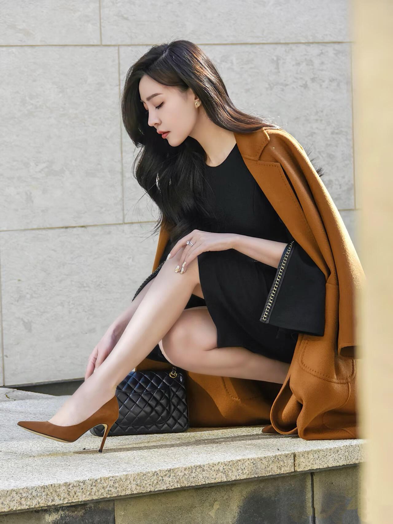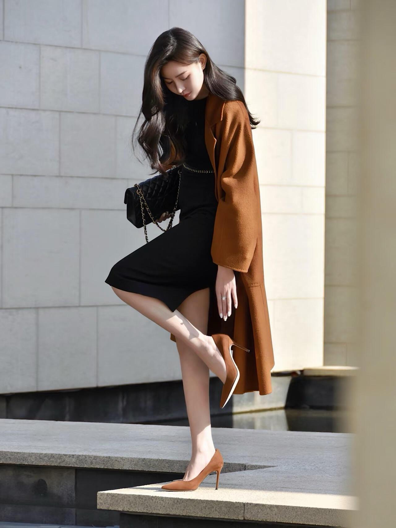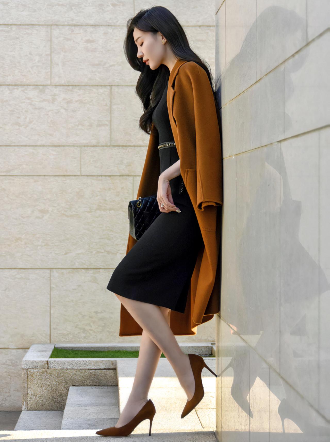 苏提达去故宫参观了,穿了一身新造型,黑色套装裙式大衣,戴着黑色皮手套,双手拿着黑