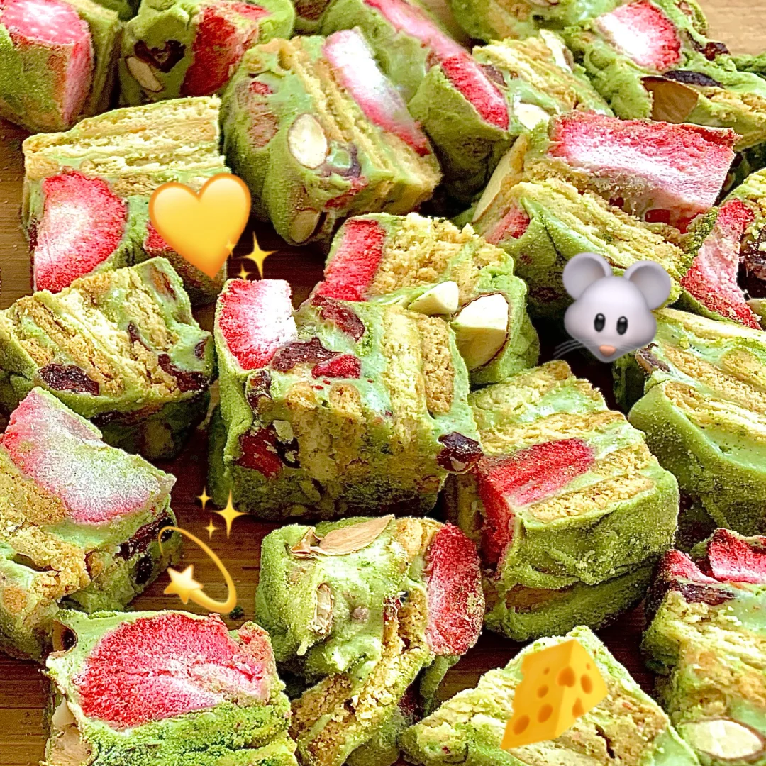 抹茶雪花酥:黄油、棉花糖、奶粉、小圆饼干、冻干草莓、巴旦木