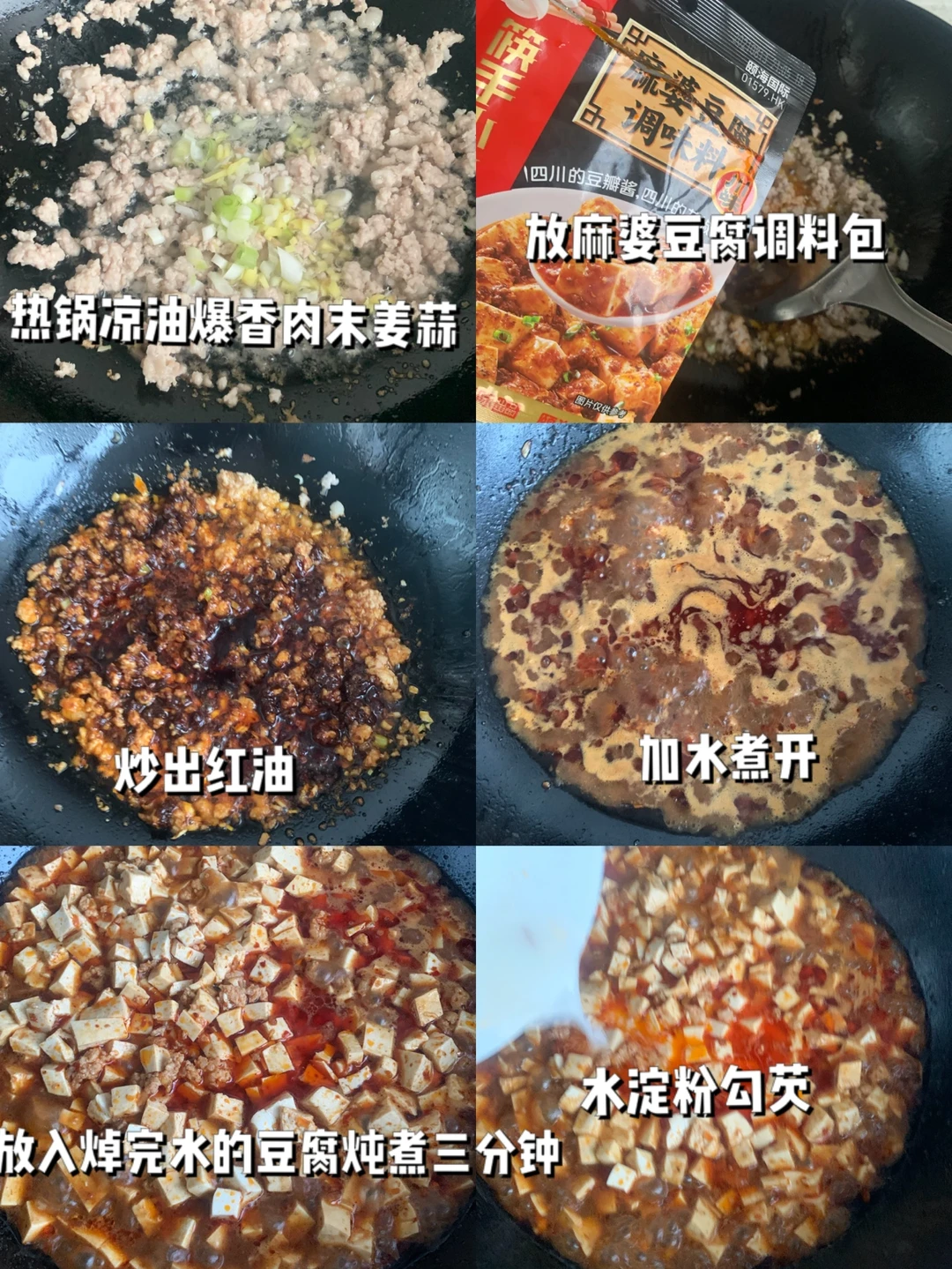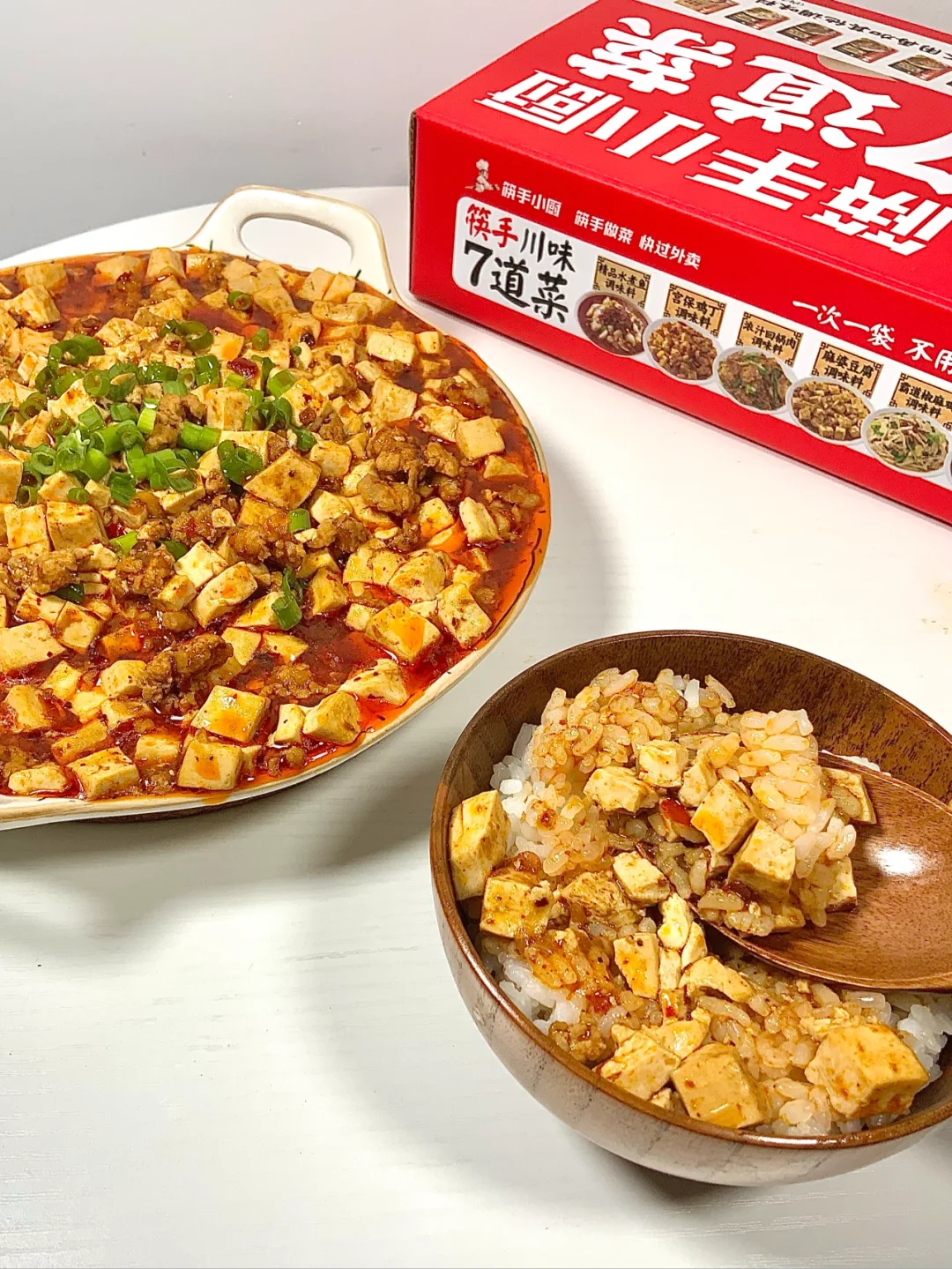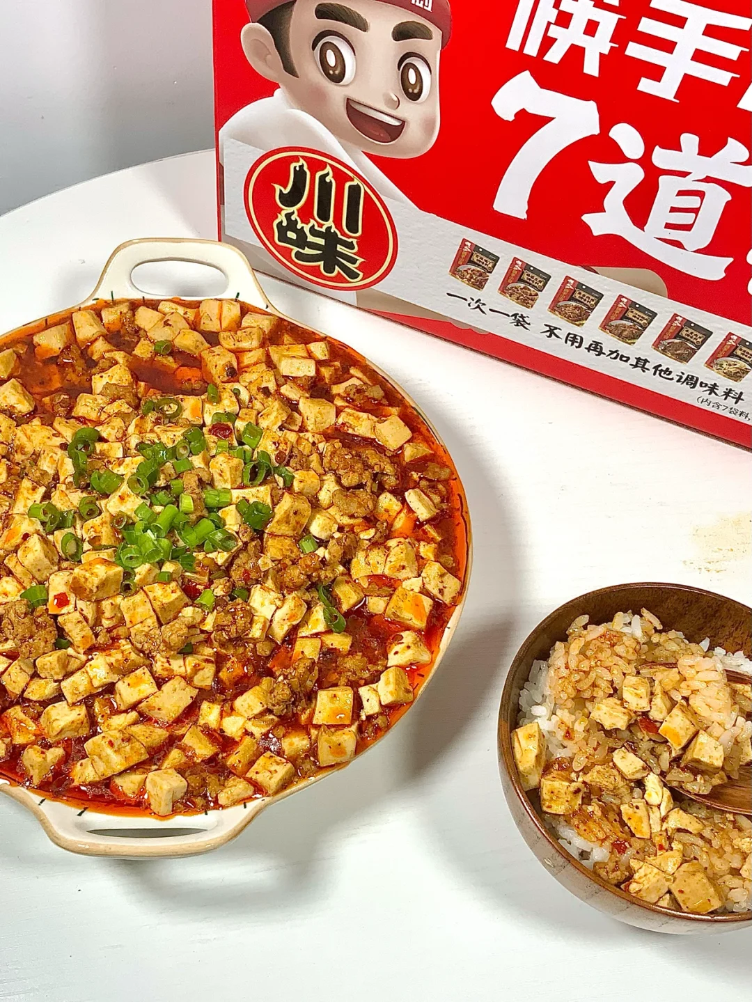 香香辣辣麻婆豆腐🥺简直拌饭神器啊😋香的不能行🤫五分钟搞定快手菜🥢 - 食材篇🥬: 豆腐、肉末、麻婆豆腐调味料 步骤篇🥣: 1、豆腐切小块后焯水备用,热锅凉油,爆香肉末和姜蒜末 2、倒入麻婆豆腐调味料,炒出红油,加水煮开后倒入豆腐,煮三分钟,水淀粉勾芡,最后撒葱花✅ - 超级香🥺拌饭神器🍚 😋调味料 一点都不齁刚刚好😘筷手小厨7道菜川味礼盒🎁简直包揽了厨房小白的餐桌🤫7道川菜经典迅速get✅