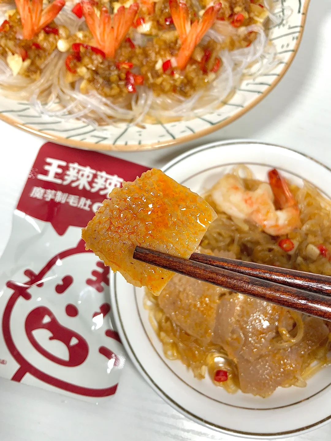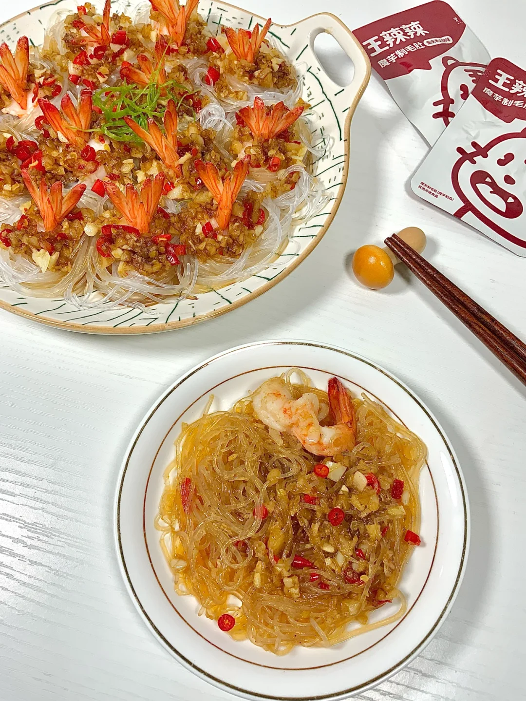 超级好吃❣️❣️蒜香味🧄虾肉鲜甜🍤 超级简单的快手菜🥺聚会必备啊好看好吃😭 - 食材篇🥬: 虾、龙口粉丝、蒜、小米辣 步骤篇🥣: 1、虾去头去壳,只留尾巴最后一点壳,从中间切开一个洞,把虾尾塞进去,这样虾就能立起来了 2、粉丝热水泡软,放入盘中,摆出一个个圈圈,虾塞入圈中 3、锅中放稍微多一些油,爆香蒜末,然后放入小米辣碎,放一勺蚝油、一勺糖翻炒均匀 4、蒜蓉酱铺在虾仁周围,淋上些蒸鱼豉油,锅中烧水,将整盘放入锅中蒸5分钟✅ - 高颜值的粉丝蒜蓉虾🍤聚会必备啊🥺蒜香虾仁香😋香香香😋再配上魔芋制毛肚🫓香香辣辣🌶️六小包才相当于半个苹果的热量🍎真的是减肥减脂期必备零食了🥺