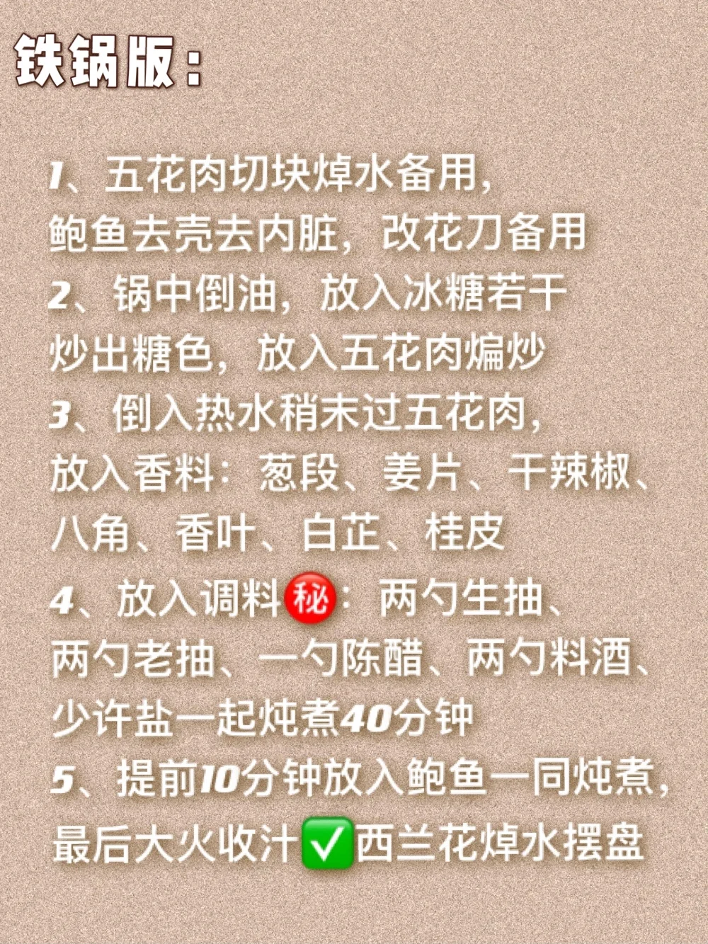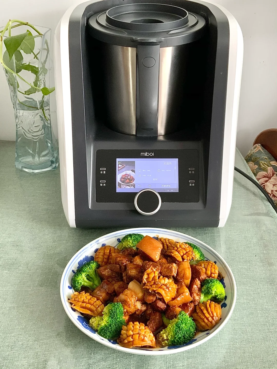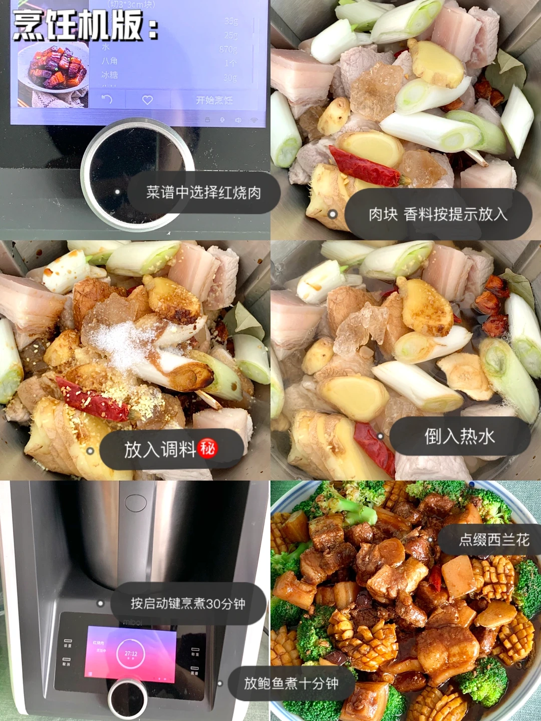 肥而不腻的红烧肉配上爽脆Q弹的鲍鱼🥺绝对是桌上的一道硬菜了❣️宴请朋友👬必备 - 食材篇🥬: 鲍鱼、五花肉、香料、西兰花 步骤篇🥣: -🌟🌟🌟铁锅版: 1、五花肉切块焯水备用,鲍鱼去壳去内脏,改花刀备用2、锅中倒油,放入冰糖若干炒出糖色,放入五花肉煸炒 3、倒入热水稍末过五花肉,放入香料:葱段、姜片、干辣椒、八角、香叶、白芷、桂皮 4、放入调料㊙️:两勺生抽、两勺老抽、一勺陈醋、两勺料酒、少许盐一起炖煮40分钟 5、提前10分钟放入鲍鱼一同炖煮,最后大火收汁✅西兰花焯水摆盘 -🌟🌟🌟烹饪机版: 烹饪机上菜谱选择红烧肉,按照提示放入五花肉、香料和调料,热水(自带称重模式超省心)一同炖煮三十分钟后,放入鲍鱼煮10分钟就ok了 - 香香糯糯肥而不腻的红烧肉配鲍鱼🥺配一碗米饭都不够吃❣️ 米博烹饪机自带百道智能菜谱🖥想吃什么就做什么😉没有油烟❣️无需看管❣️是小白的福音🥺