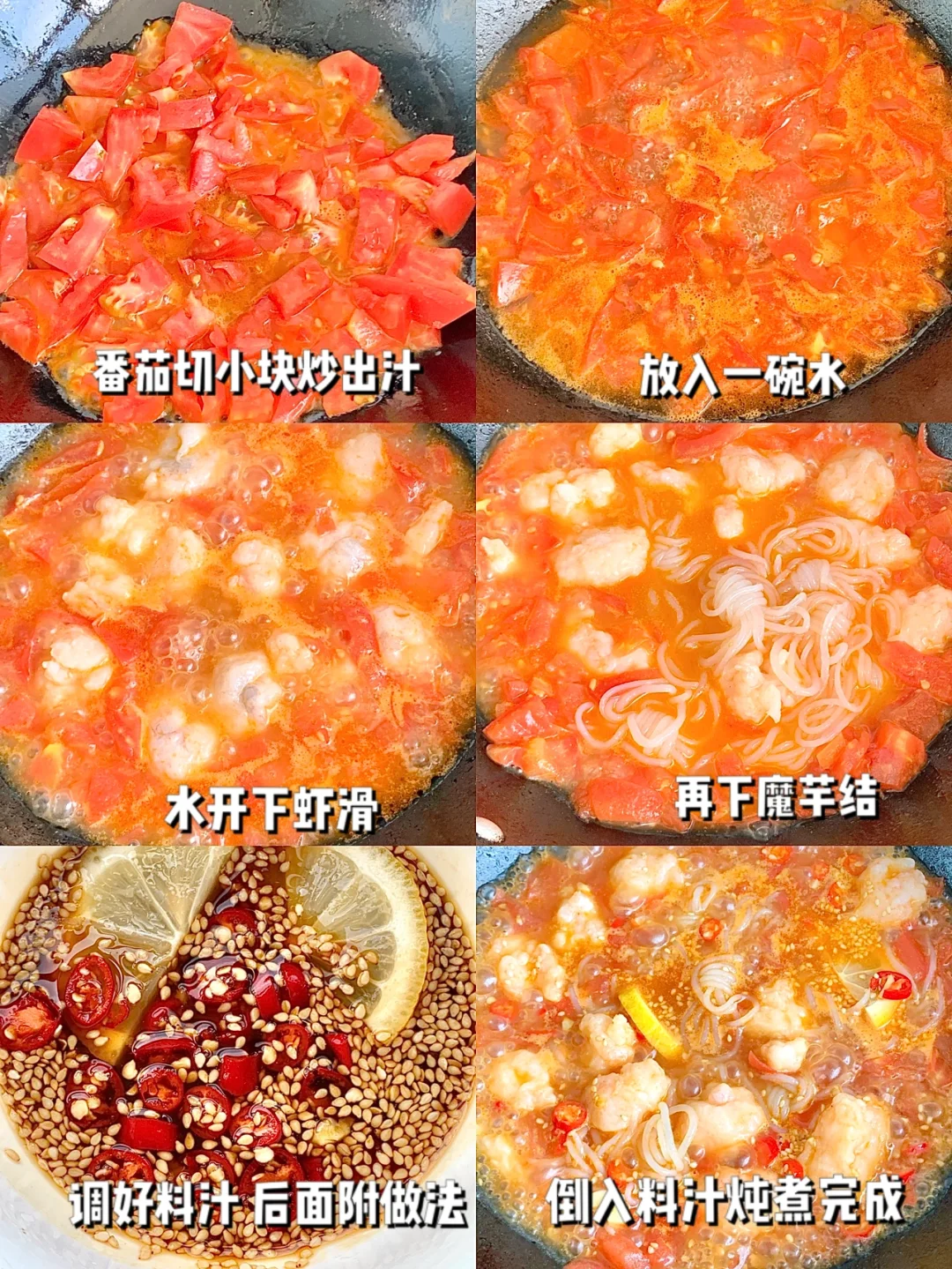 酸酸辣辣🥺超级开胃🍅番茄味浓郁配上QQ弹弹的虾滑🍤夏日必备了 - 食材篇🥬: 虾滑、番茄、魔芋结、柠檬 步骤篇🥣: 1、番茄切小块,炒出汁水,放入一碗水炖煮 2、水开后下虾滑,再下魔芋结一同炖煮 3、提前调好调料㊙倒入️:两勺生抽、一勺香醋、一勺蚝油、一勺番茄酱、少许香油、少许糖,撒入芝麻、柠檬汁、蒜末、小米辣搅拌均匀 - 酸酸辣辣好开胃🥺QQ弹弹的虾滑🍤配低脂魔芋结饱吸番茄🍅汤汁