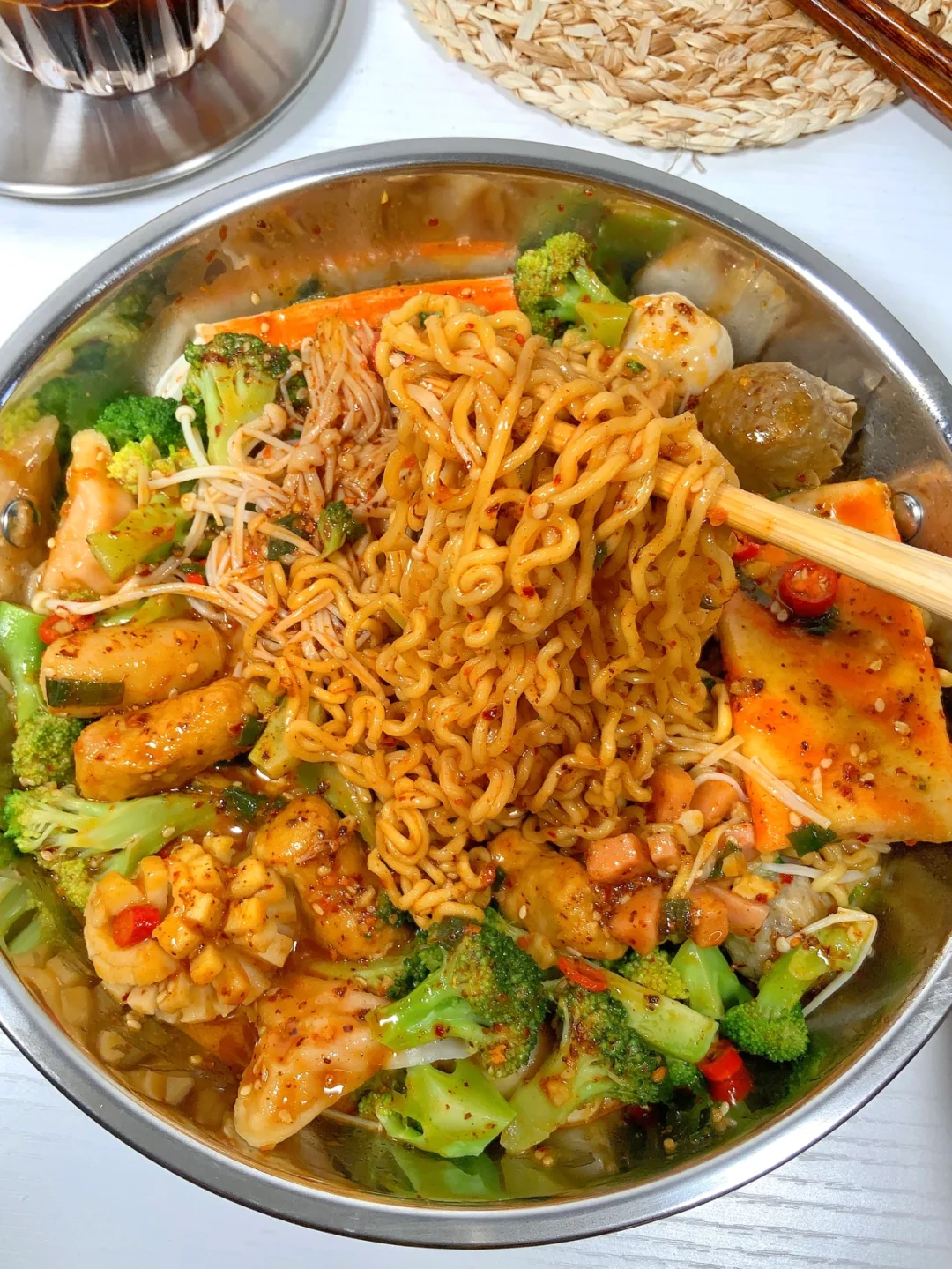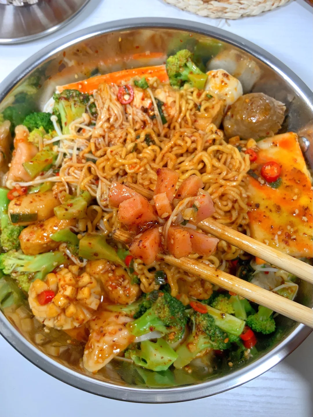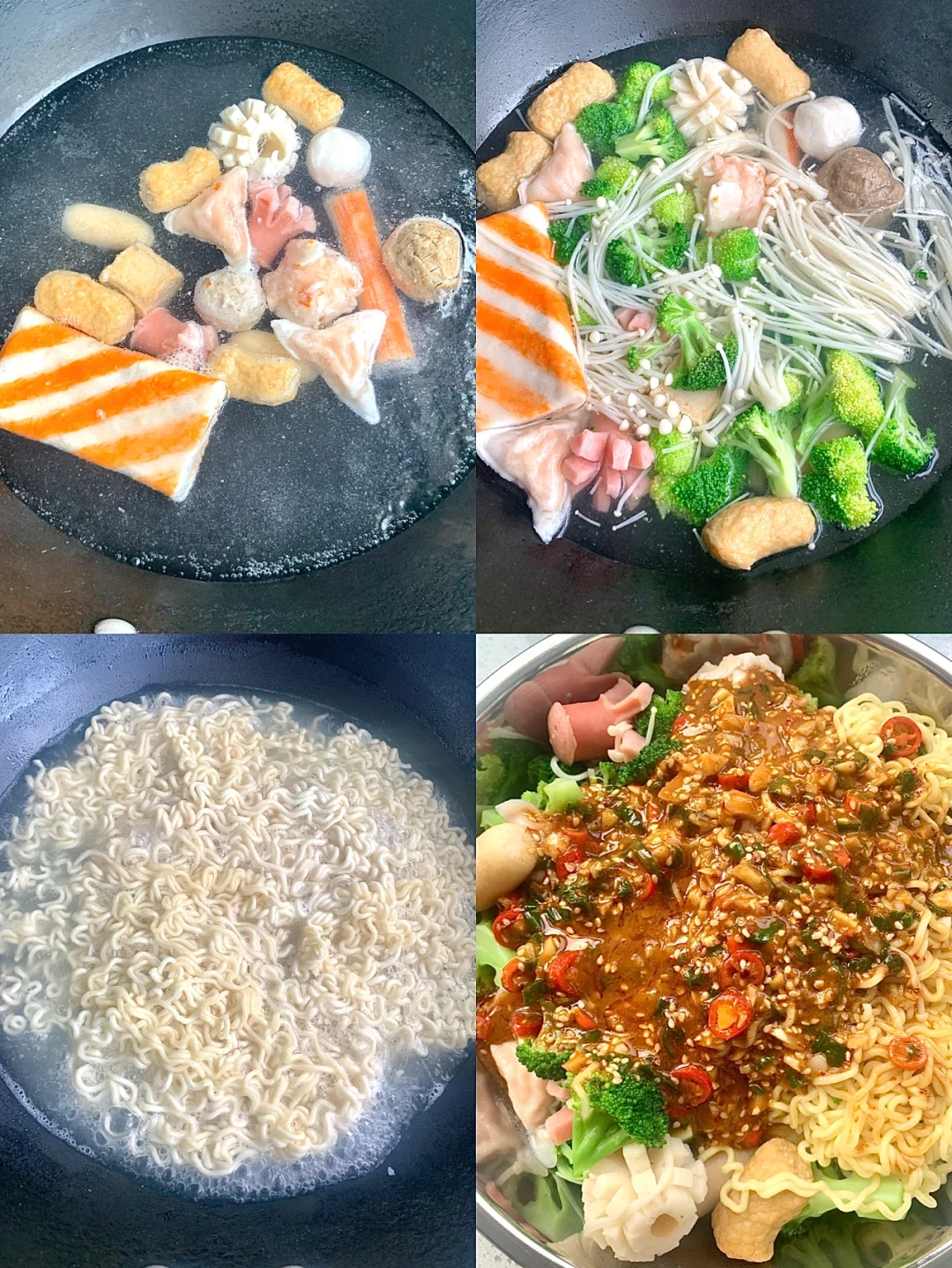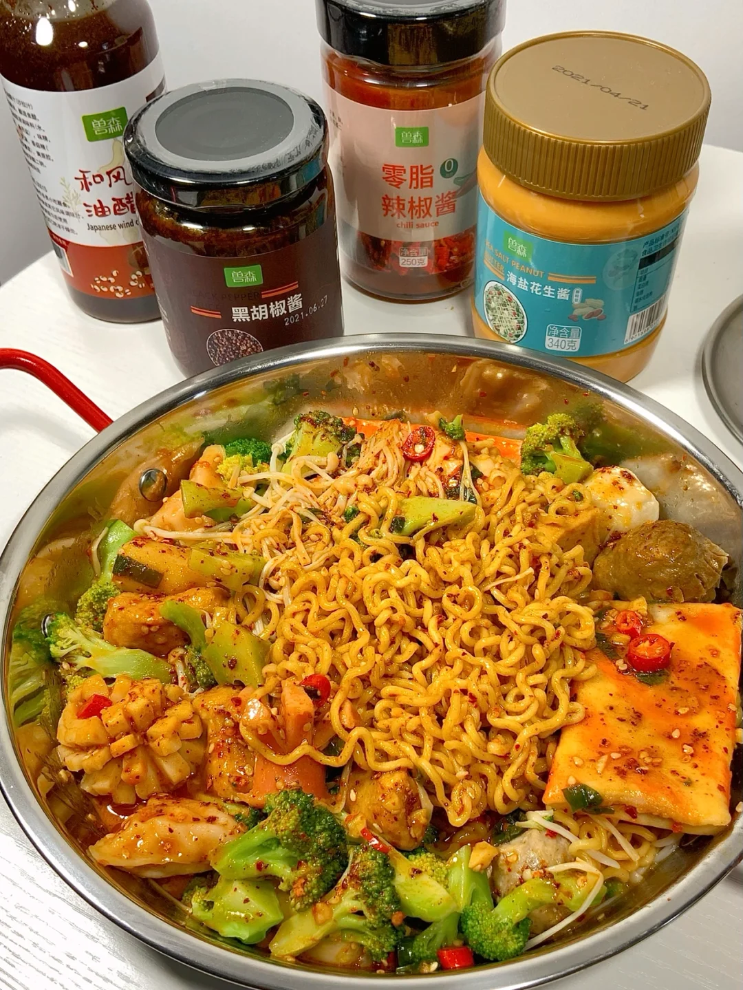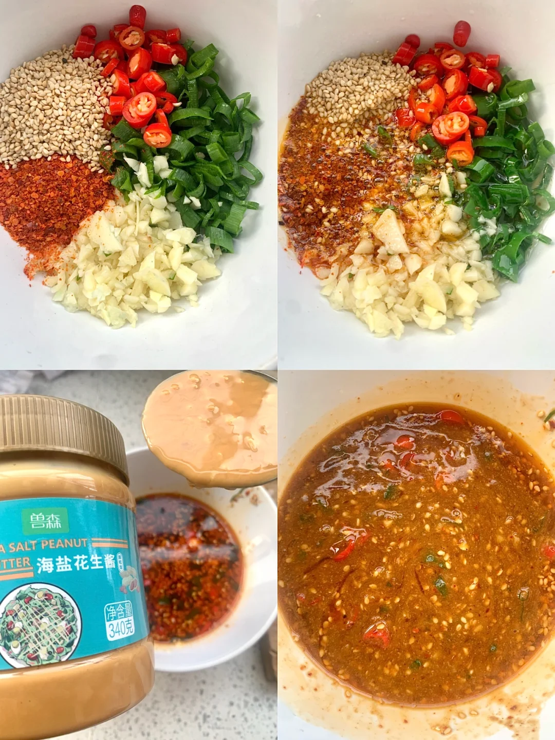 夏天不只要吃一次麻辣拌❣️酸辣开胃❣️秘方快学起来👍👍 - 食材篇🥬: 火锅丸子、蔬菜、方便面、花生酱 步骤篇🥣: 1、碗中放入:蒜末、葱末、小米辣、辣椒面、芝麻,浇入热油 2、放调料㊙️:两勺生抽、两勺陈醋、一勺蚝油、一勺白糖、少许盐、一勺花生酱(芝麻酱)喜欢酱汁浓的可以多放⚠️ 3、锅中烧水,水开先下火锅丸子,再下蔬菜煮熟后捞出,泡面煮熟捞出,酱料抓拌均匀✅ - 酸酸辣辣❣️裹满酱汁❣️麻辣拌也太好吃啦🥺分享减脂期的酱料🥃0糖0脂无添加❣️放心吃啦