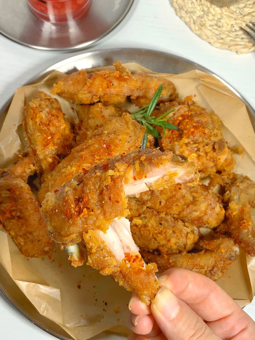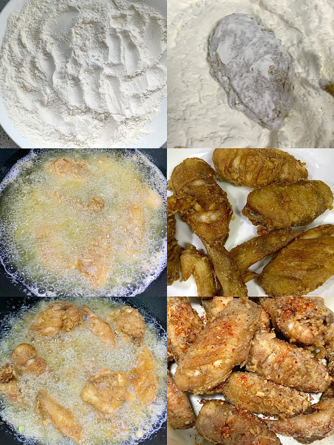 中式炸鸡yyds蒜香🧄鸡翅也太好吃了吧😋快来试试吧超快手🥺 食材篇🥬: 鸡翅、淀粉 步骤篇🥣: 1、鸡翅洗净,两面划花刀,放入一勺蒜末、一勺葱花 2、放入调料㊙️:一勺料酒、一勺蚝油、两勺生抽、少许盐、糖、黑胡椒 3、搅拌均匀,腌制半个小时,鸡翅两面裹满淀粉 4、锅中油到六成热放入鸡翅,中小火炸7-8分钟后捞出,油温升高后复炸30秒✅ 5、撒黑胡椒和辣椒面,开吃! - 蒜香鸡翅yyds真的太好吃了🥺再配上冰西瓜🍉或者冰饮料🥤爽😊