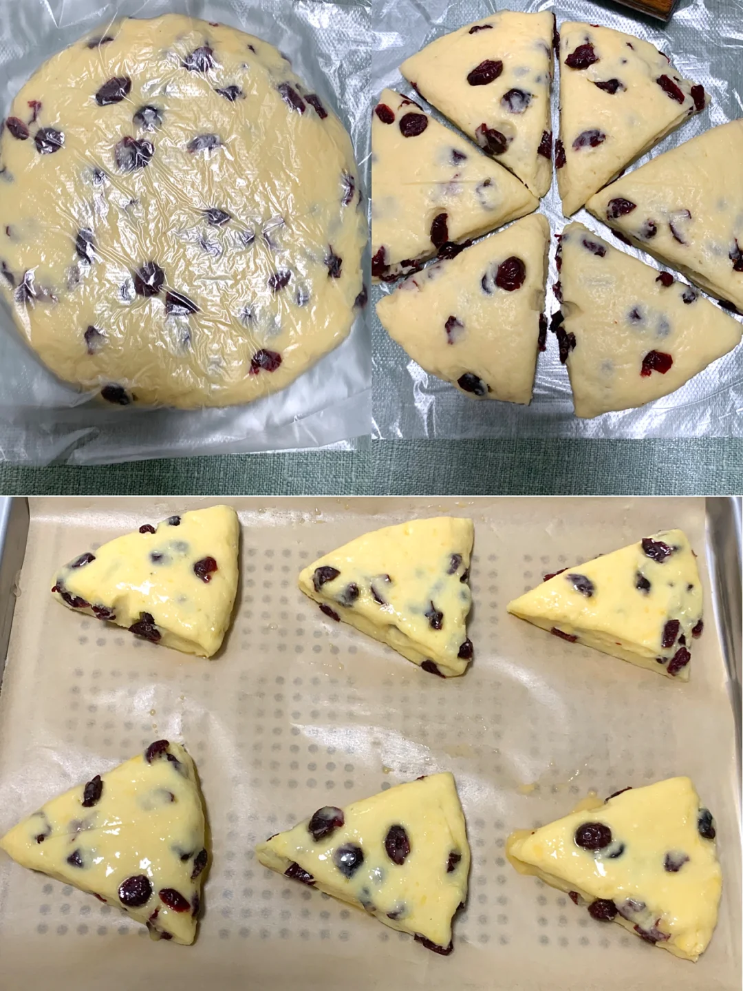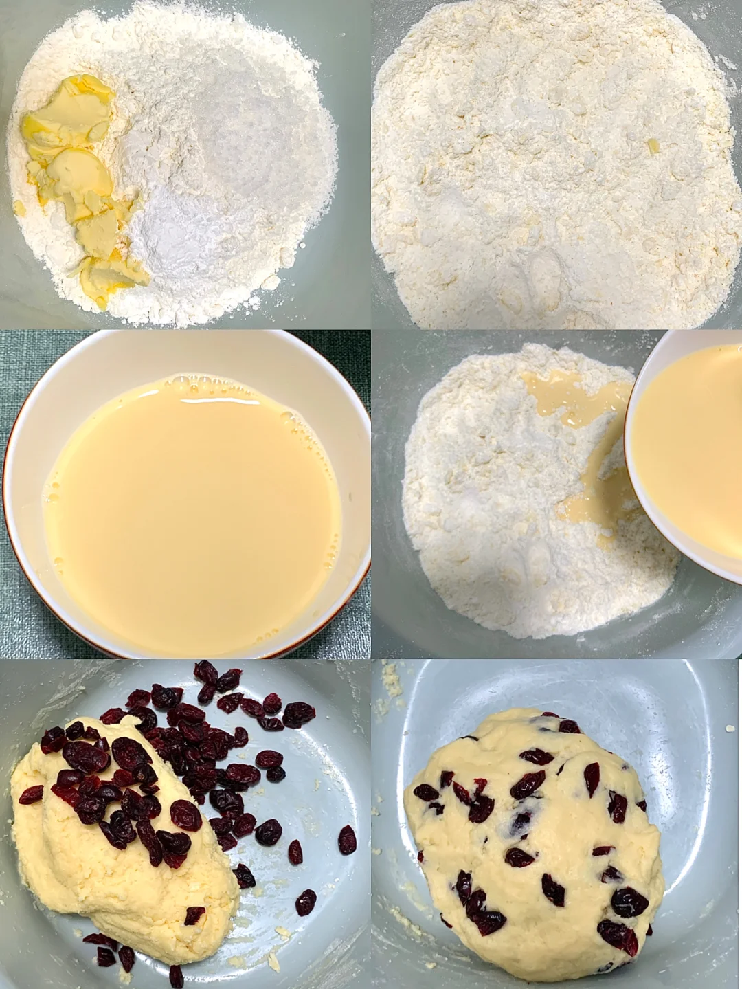 低粉200g、黄油45g、糖20g、盐2g、泡打粉5g、鸡蛋液40g、牛奶70g、蔓越莓干