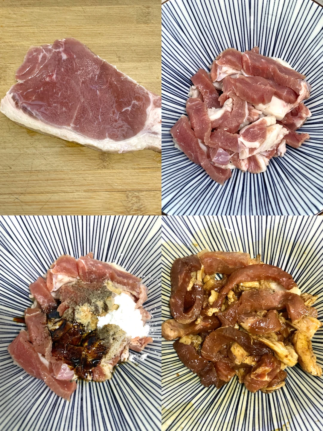 1、牛排切条,放入一勺生抽、半勺老抽、一勺黑胡椒、一勺淀粉、半勺食用油、一勺水抓匀腌制半个小时
