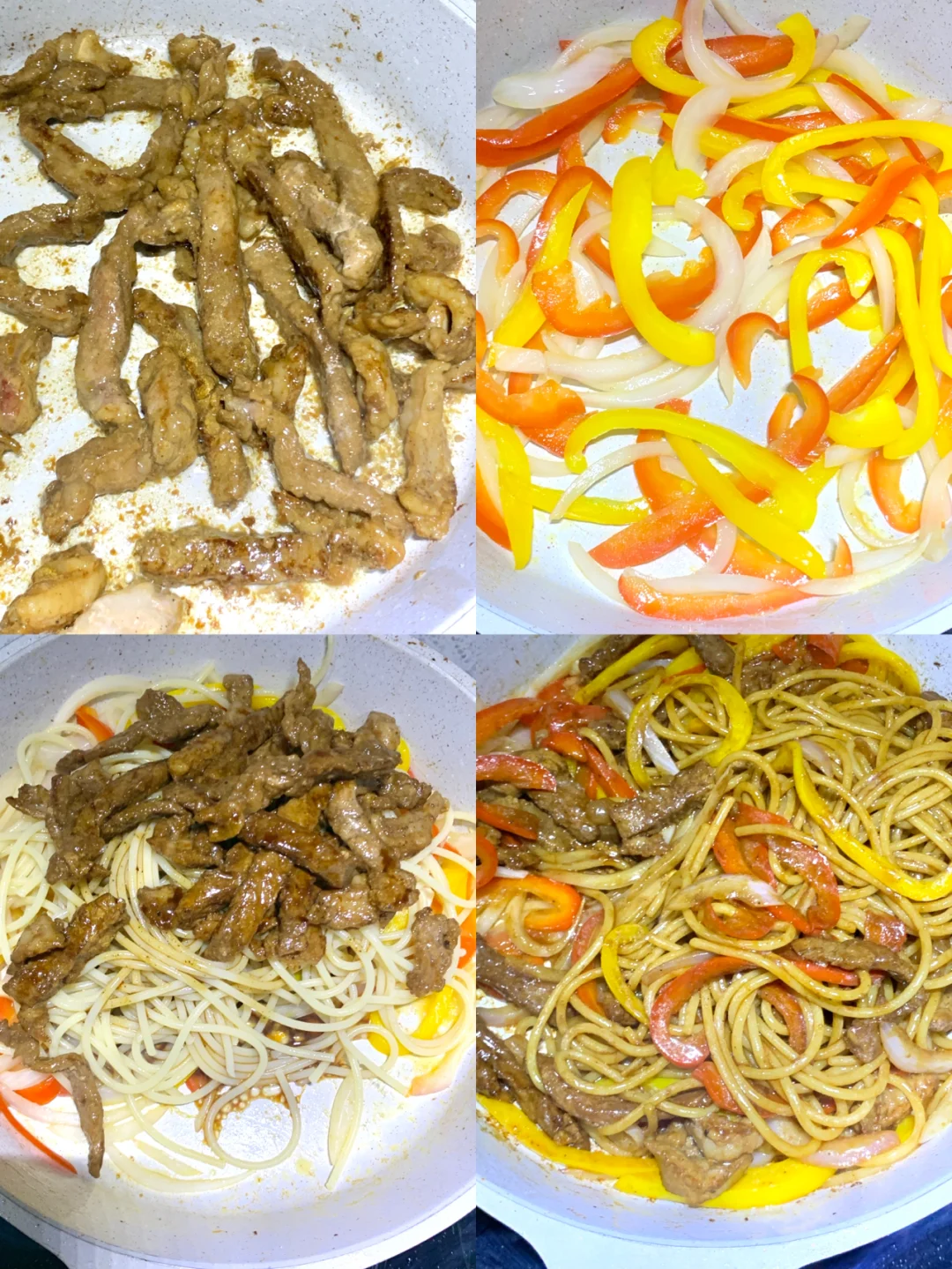 4、锅中放油,牛排条煎至变色乘出,锅中放油放入蔬菜炒至变软后放入牛排、意面和黑椒汁翻拌均匀✅