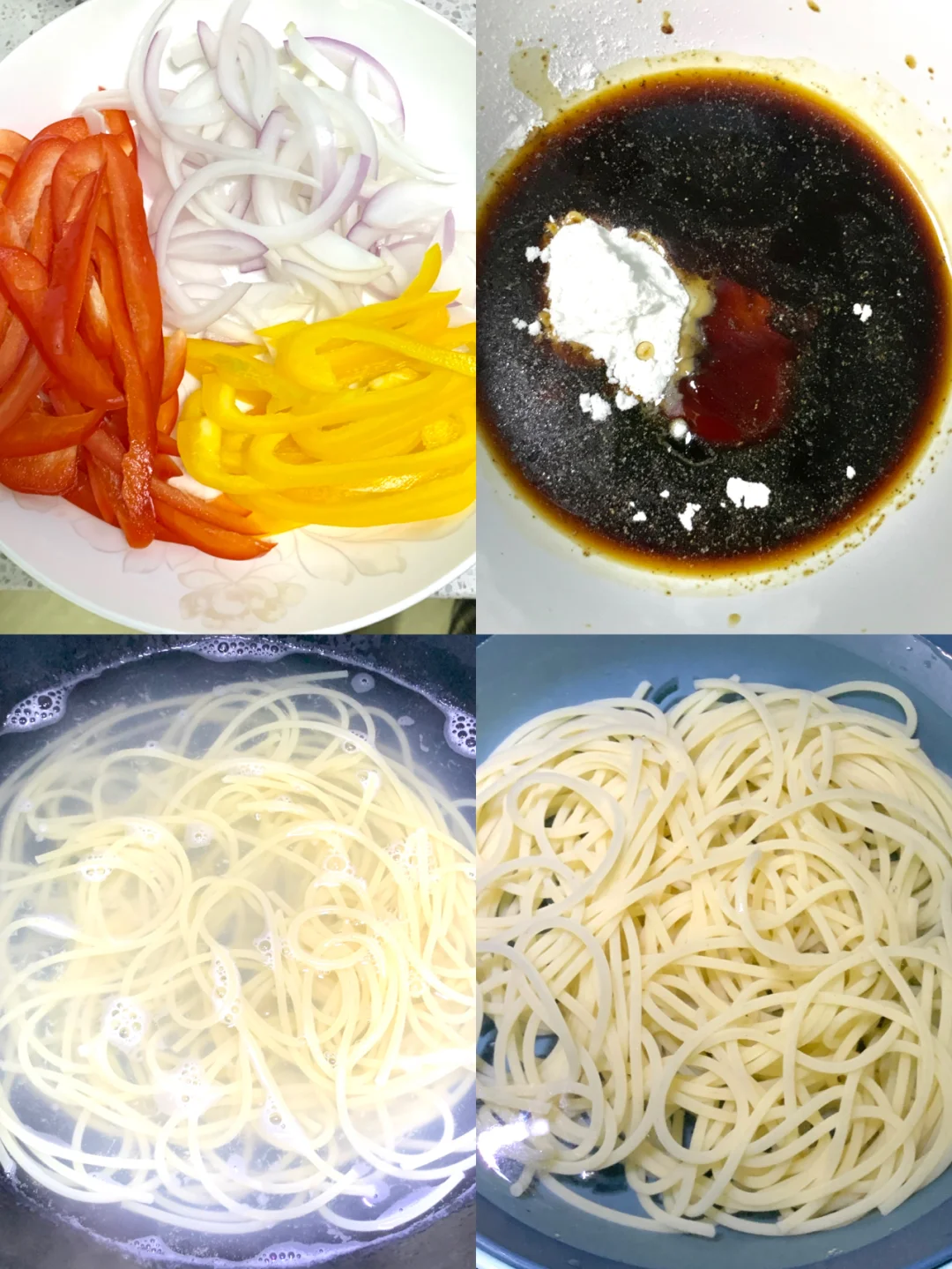 3、彩椒、洋葱切丝备用,锅中烧水,将意面煮熟捞出过凉备用