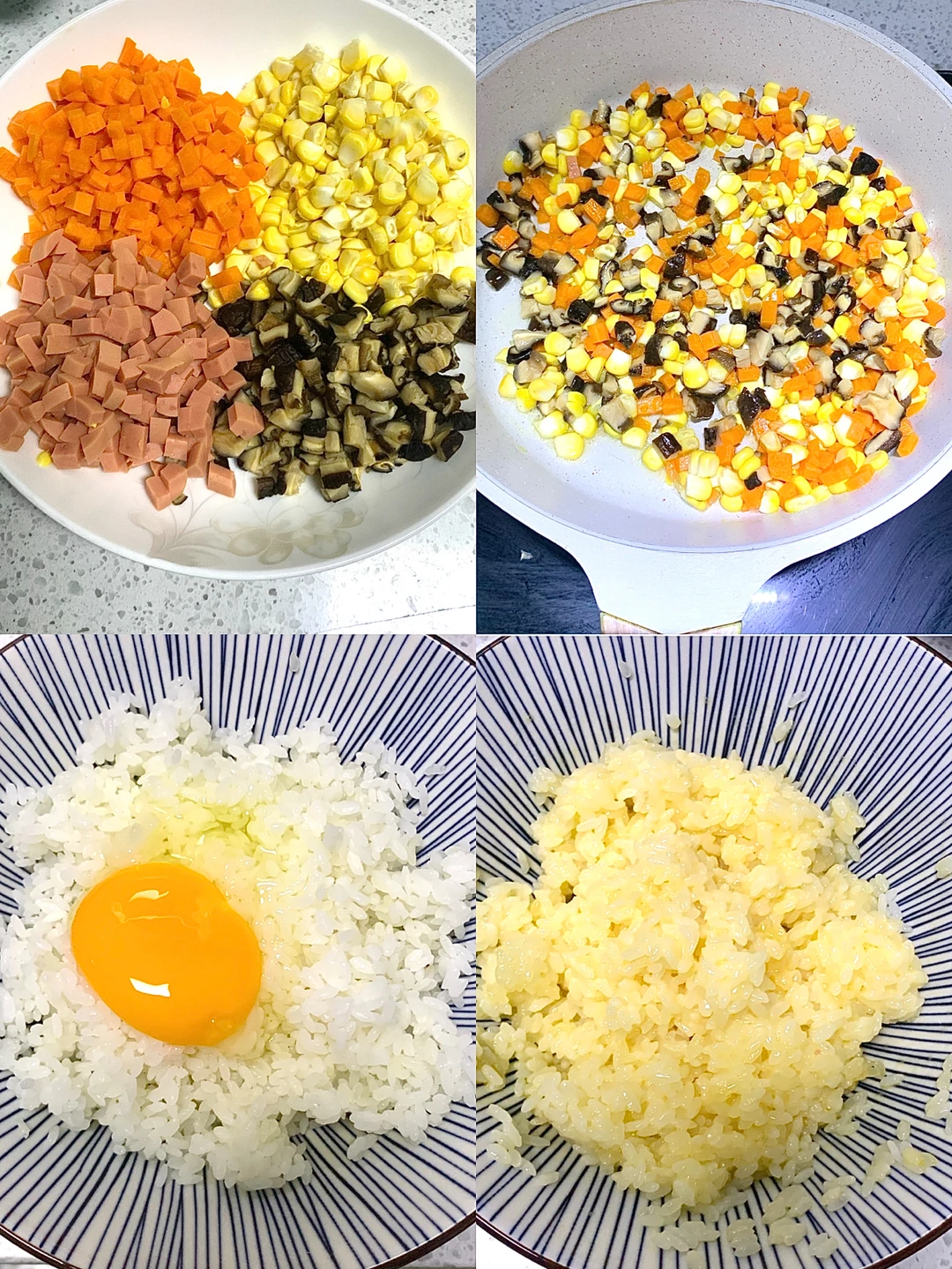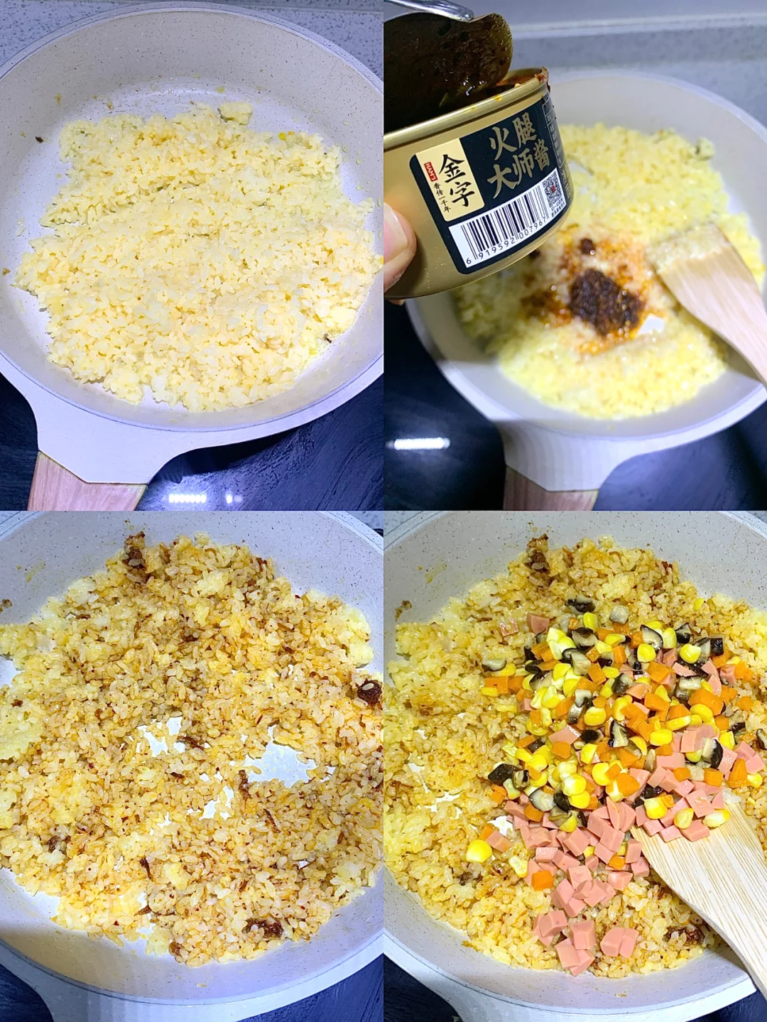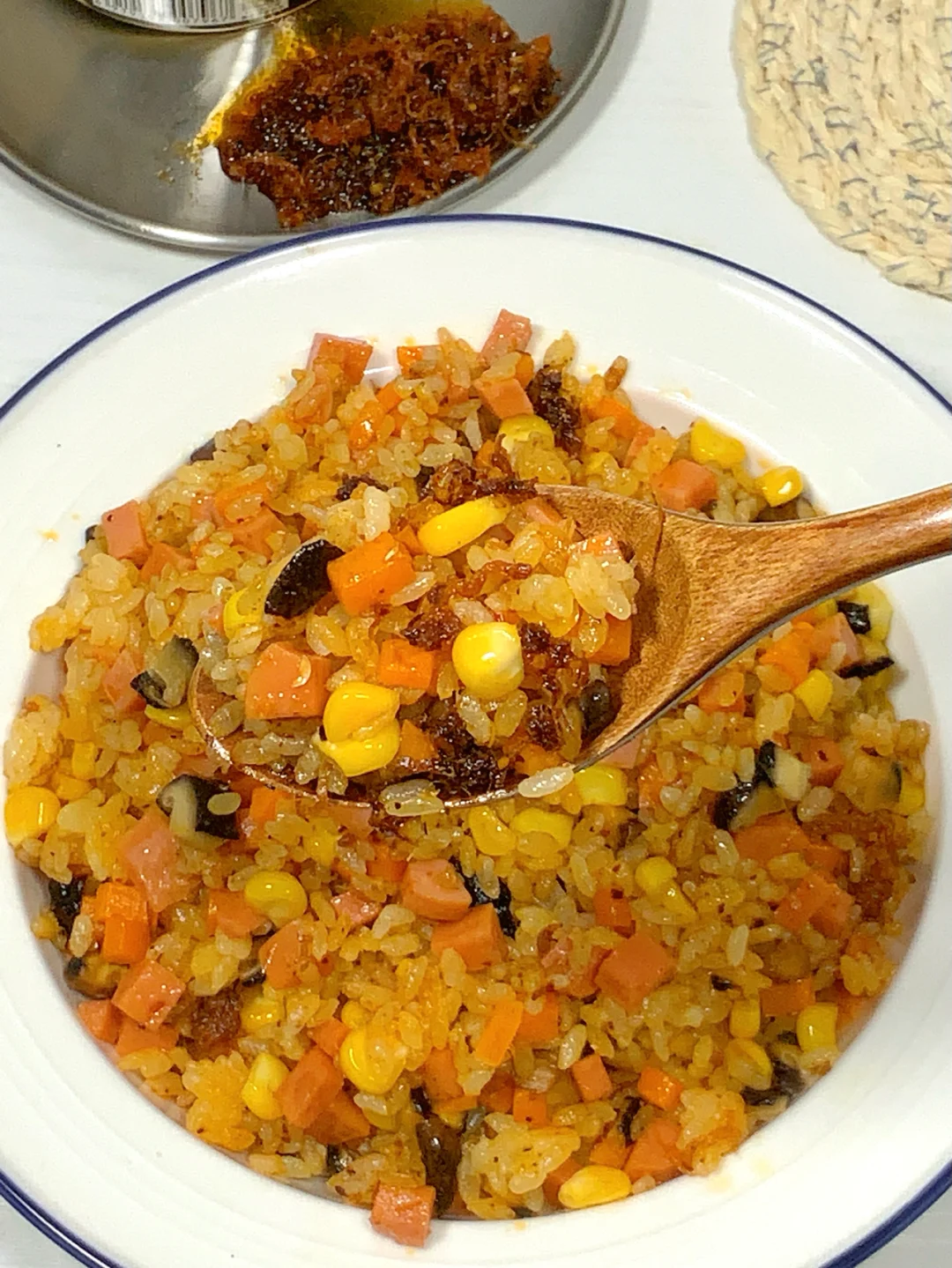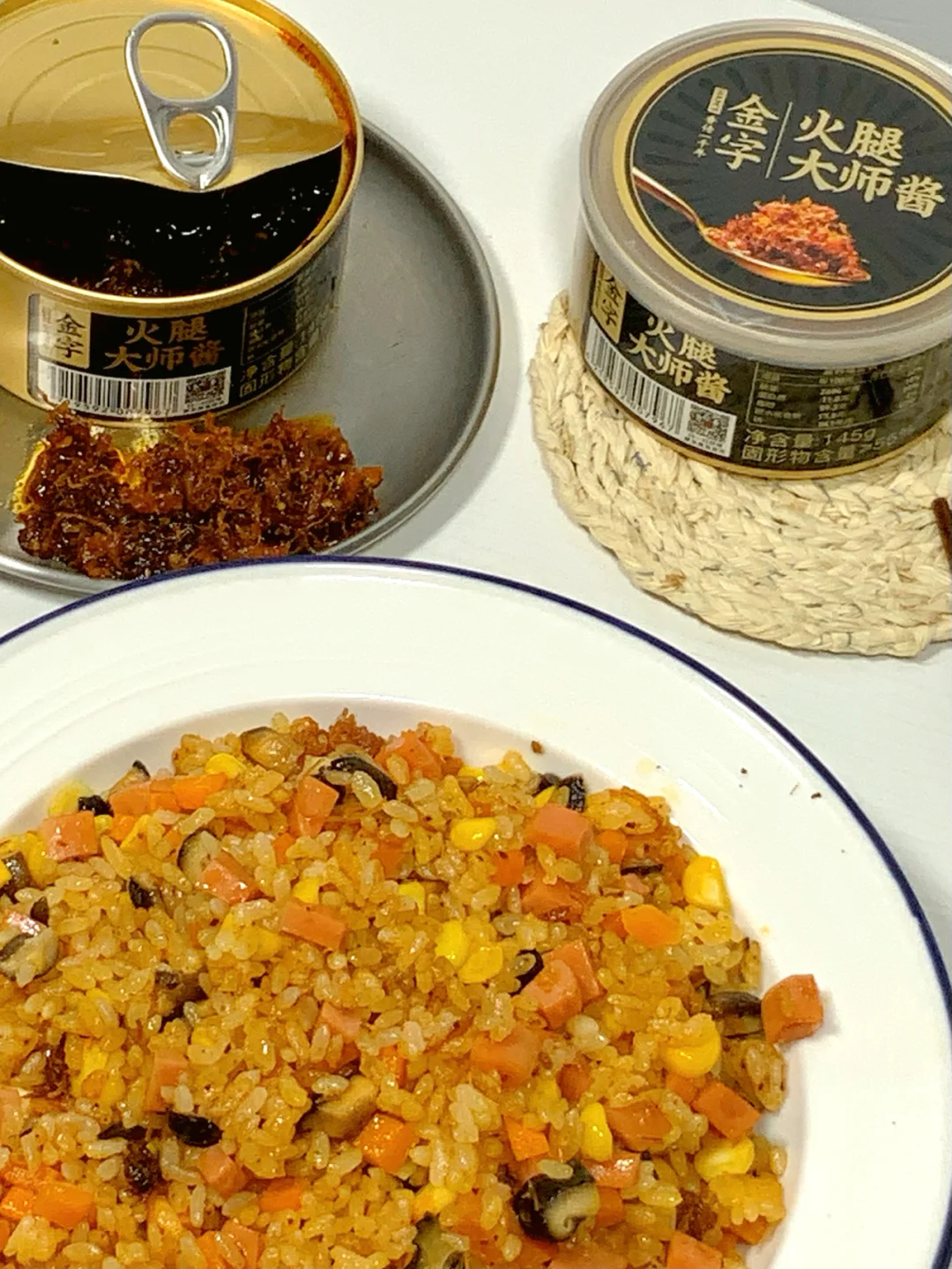 普通的炒饭吃腻了吧❣️快来试试我的三鲜炒饭🥺超好吃👍👍👍 食材篇🥬: 胡萝卜、玉米粒、香菇、火腿肠、酱料(XO酱、柱侯酱、火腿酱....都可)、鸡蛋、剩米饭 步骤篇🥣: 1、食材中除了火腿肠外都放入锅中炒至断生,乘出备用 2、剩米饭中放入一个鸡蛋捏碎拌均,锅中放油,裹满蛋液的米饭翻炒 3、放入一勺酱料,翻炒均匀,再放入其他食材,稍微放一点点盐就能出锅了(酱料本身就有味) - 一切鲜美的酱料放进炒饭里都是天花板了🥺金字火腿大师酱:虾仁、瑶柱、火腿三合一❣️拌饭拌面鲜鲜鲜🐟