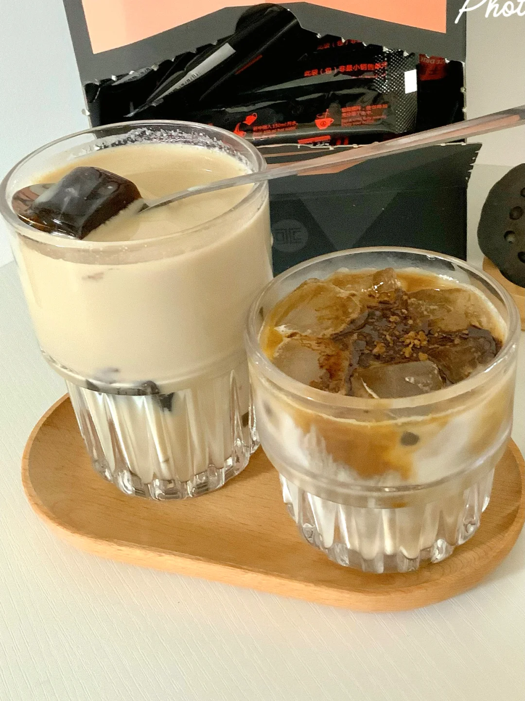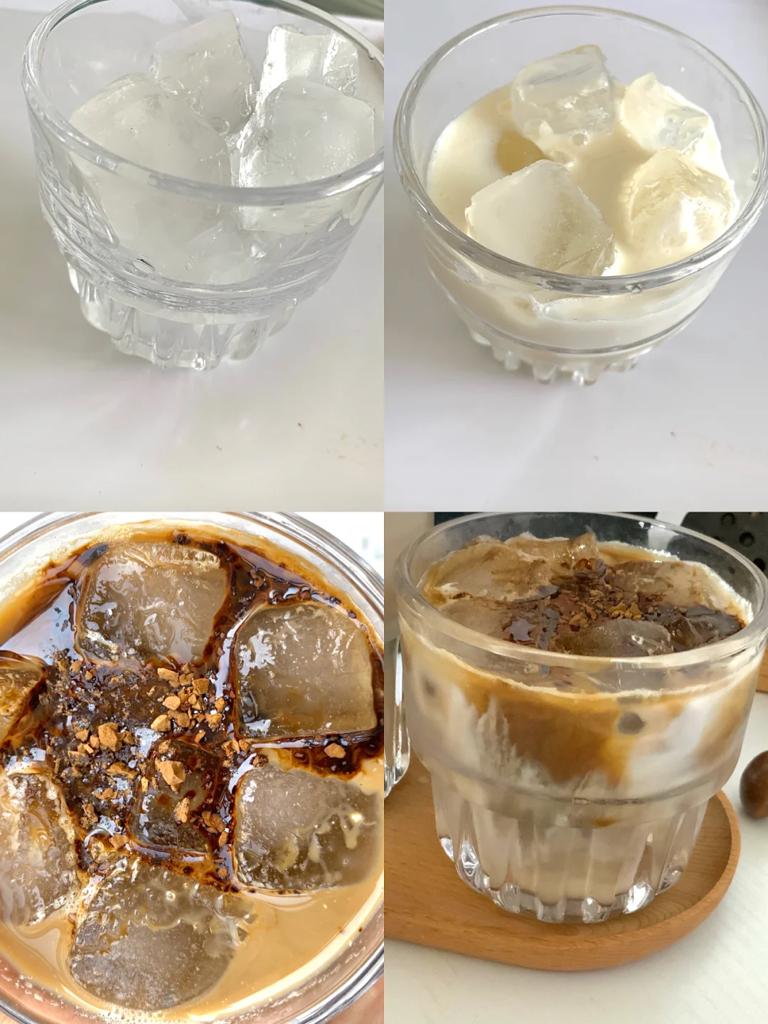 4、冰块放入杯中,倒入牛奶,淋上咖啡液,冰拿铁✅