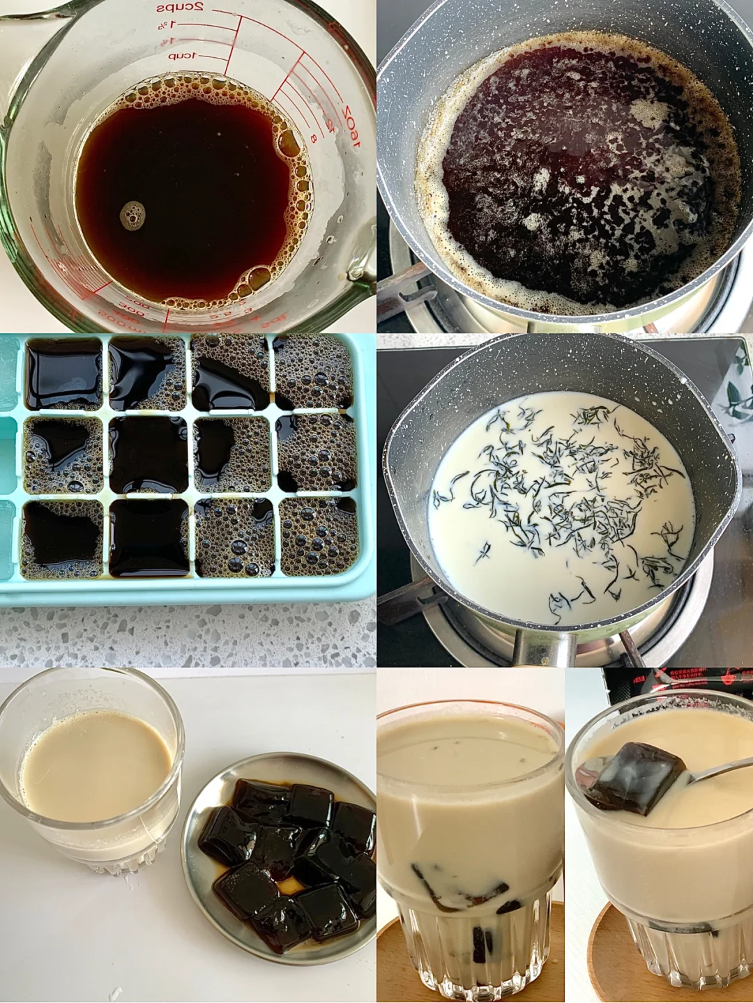 3、茶叶牛奶一起煮开,滤出茶叶渣倒入杯中,放入冷藏成块的咖啡冻,咖啡冻奶茶✅
