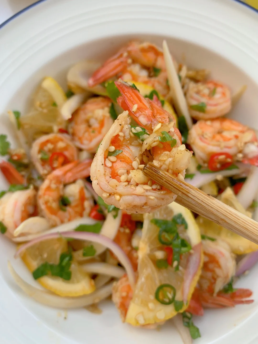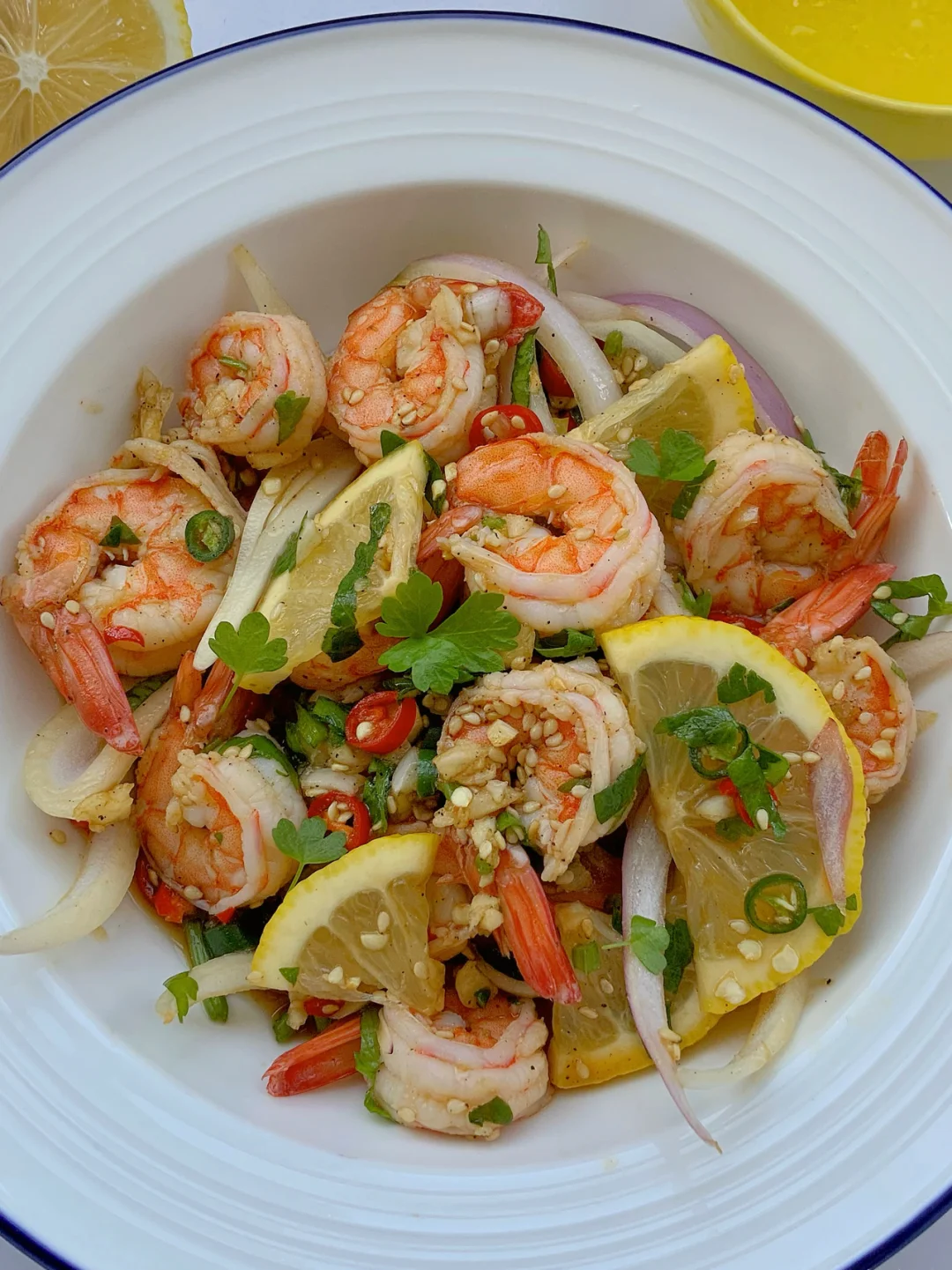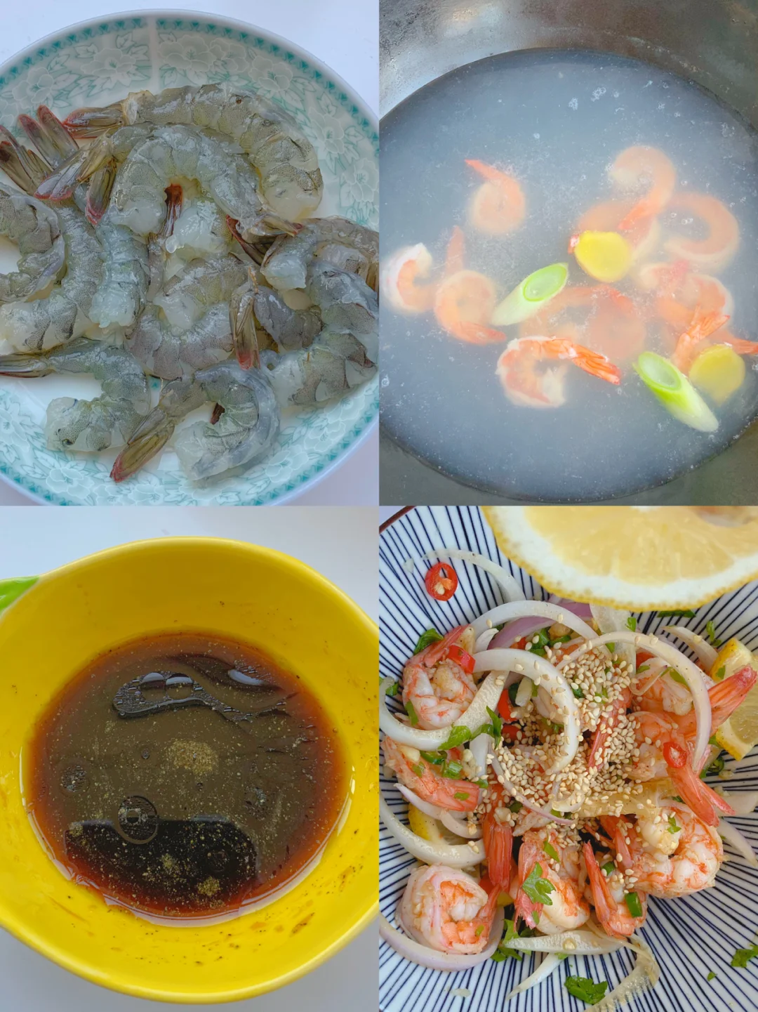低脂低卡的柠檬虾来咯❣️酸酸辣辣减脂快乐餐🥗 食材篇🥬: 虾、柠檬、洋葱、小米辣、蒜、芝麻、香菜 步骤篇🥣: 1、准备的食材切碎备用,鲜虾开背去虾线,锅中烧水放入葱姜料酒,将虾放入焯水一分钟捞出 2、准备调料㊙️:2勺生抽、1勺蚝油、一勺香油、一勺陈醋、一勺糖、少许盐、少许胡椒粉 3、将切碎的食材和虾混合倒入调好的料汁,挤入些柠檬汁抓拌均匀,撒上芝麻✅ - 酸辣鲜香❣️Q弹的口感让人欲罢不能🤫快来试试吧👩🍳