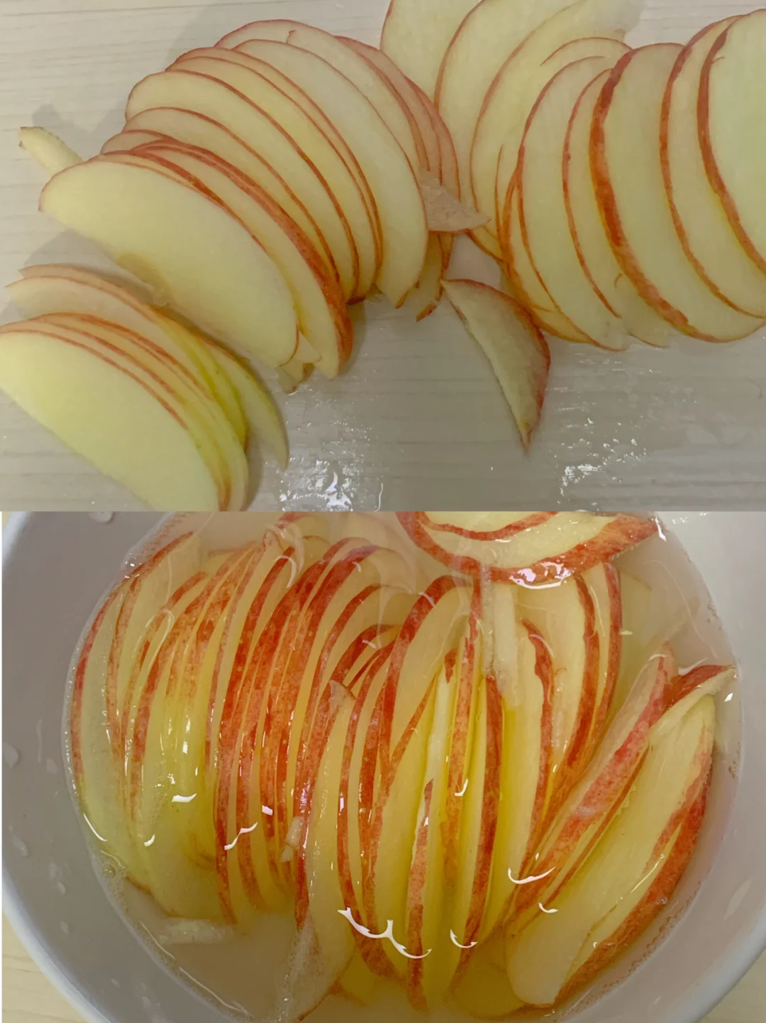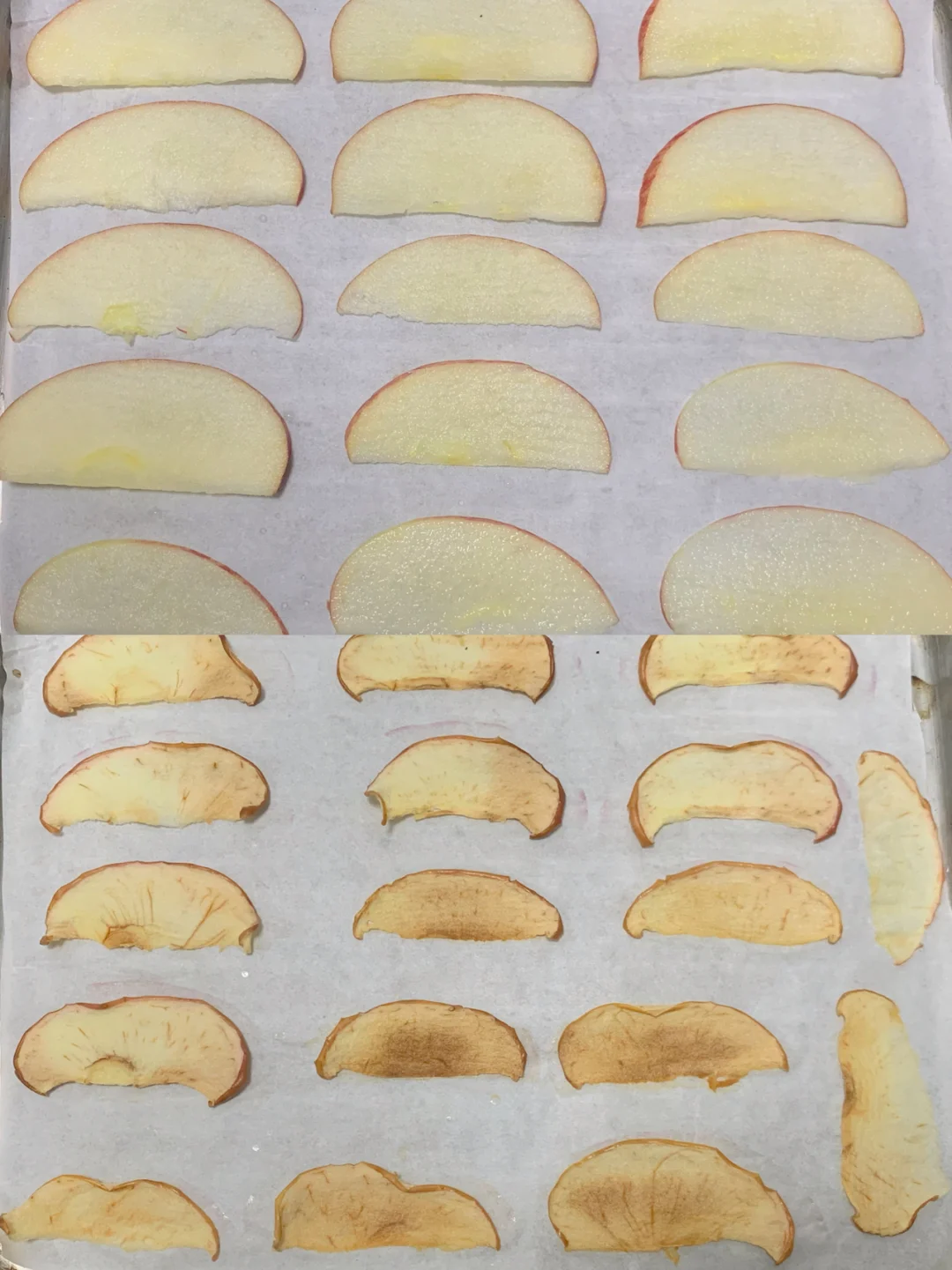嘎嘣脆🍎健康美味的苹果脆片来咯❣️自制低脂零食无添加剂🥺 食材篇🥬: 苹果 步骤篇🥣: 1、苹果去核切薄片,尽量薄,碗中放水和一勺盐,将苹果片浸泡三分钟 2、将苹果片放入烤箱90-100度(烘烤90-100分钟)看自家烤箱脾气而定✅ 3、⚠️拿出的苹果片有的还有些软,放凉就变脆啦(如果放凉还不脆的就是苹果片的水分还没考干,还得回炉烤一下哦😯) - 一片一片根本停不下来,追剧必备小零食👩💻健康低脂负担🤟