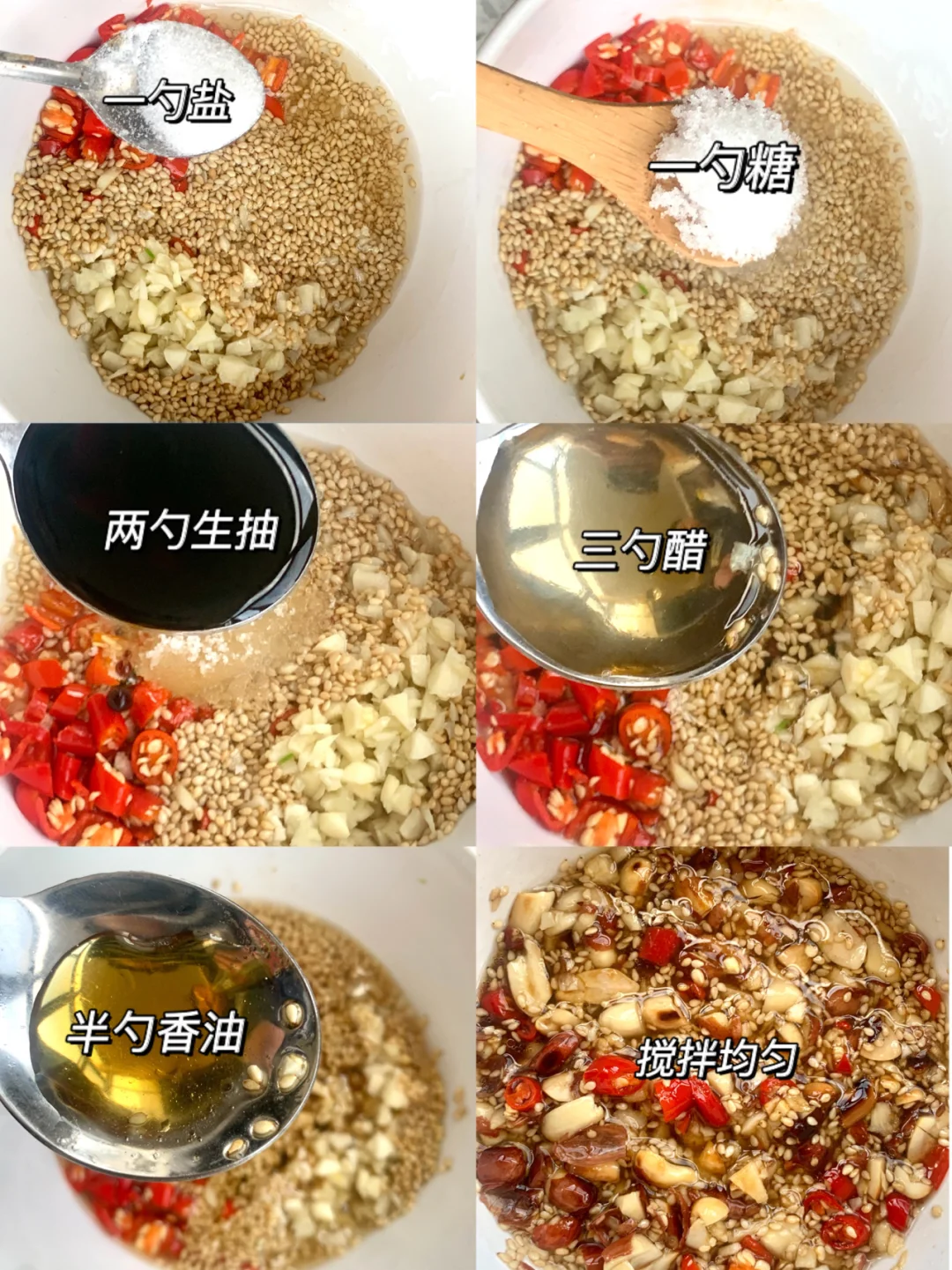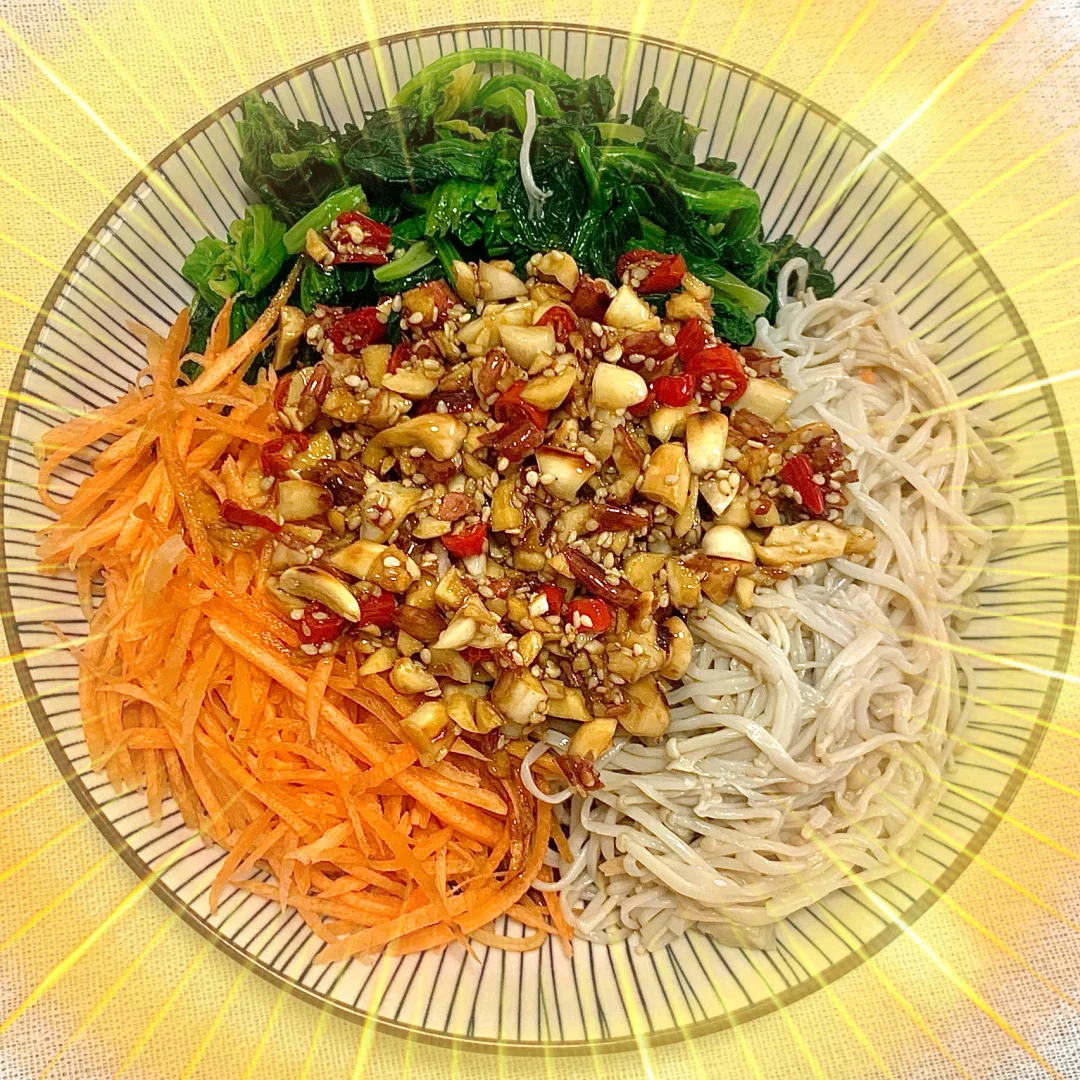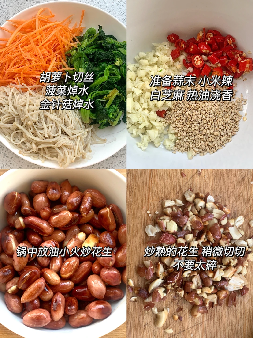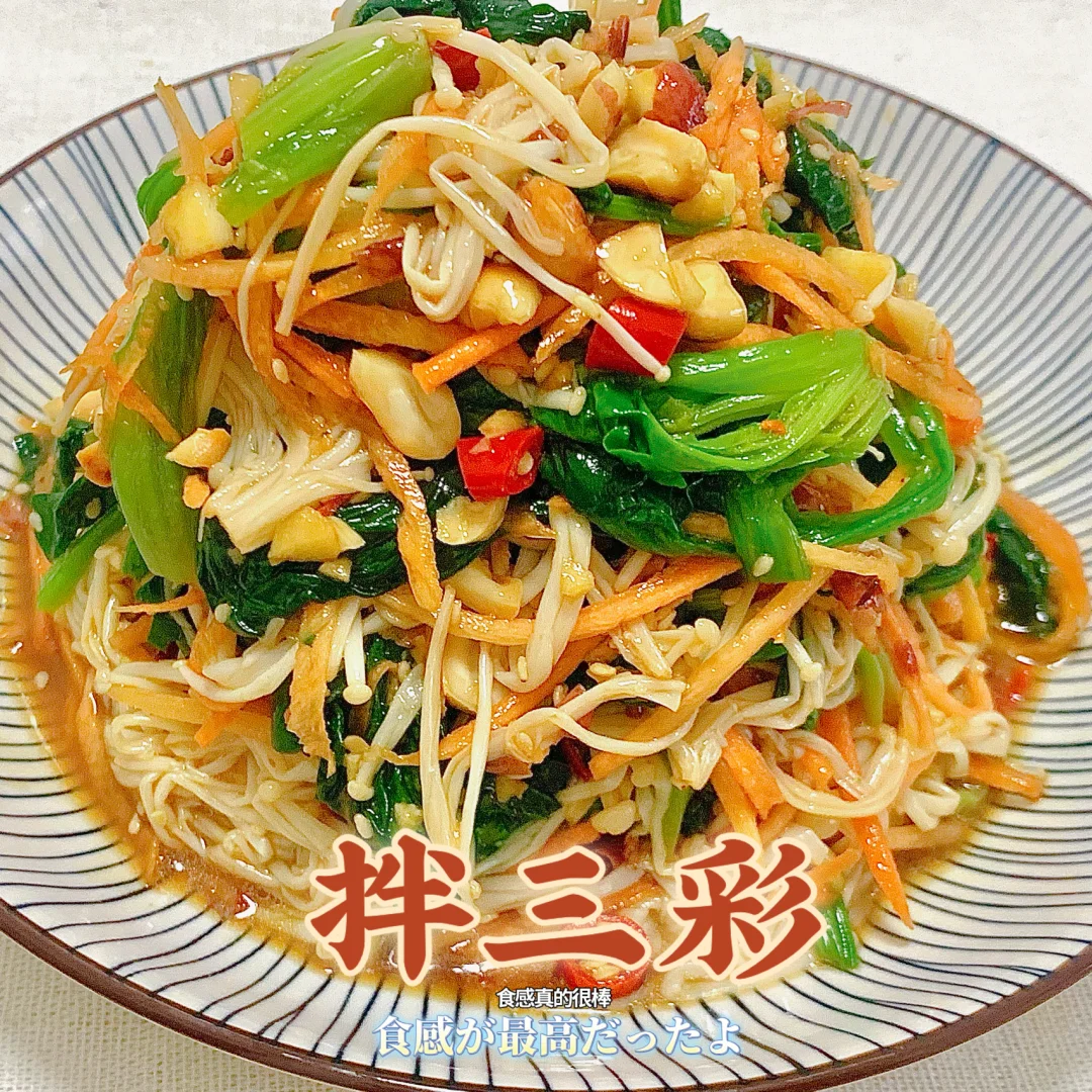 年夜饭里的大鱼大肉不断🥓偶尔也得来点凉拌蔬菜开胃解腻🥗酸酸辣辣很可口👧 食材篇🥬: 菠菜、胡萝卜、金针菇、花生、芝麻、小米辣、蒜 步骤篇🥣: 1、胡萝卜切丝、菠菜焯水、金针菇焯水,锅中放油,小火将花生炒熟,拍碎 2、切碎的蒜、小米辣、芝麻放入碗中泼入热油 3、放入调料㊙️:一勺盐、一勺糖、两勺生抽、三勺醋、半勺香油,放入花生碎搅拌均匀 4、料汁淋入三彩中,抓拌均匀就完成了✅