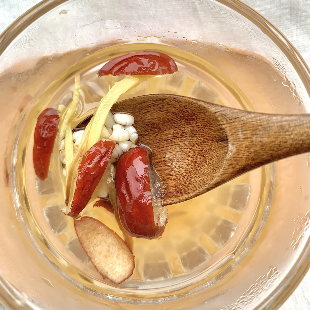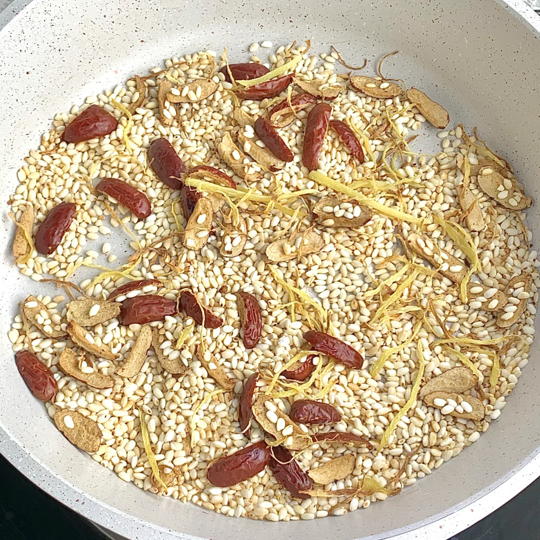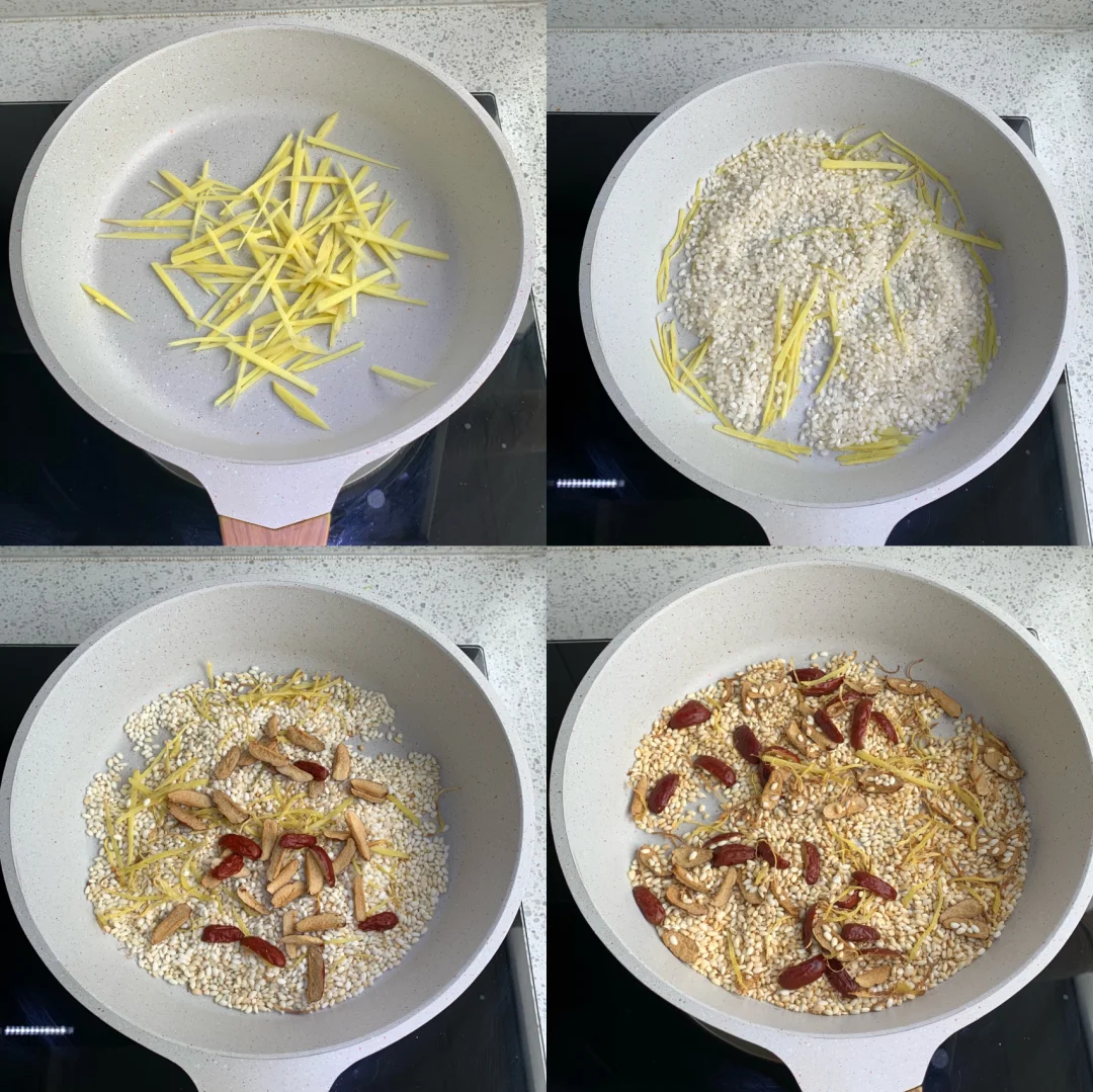 姜米茶老一辈人也叫糊米水,去油解腻、暖宫暖胃、功效颇多🥱 食材篇🥬: 红枣、大米、姜 步骤篇🥣: 1、姜去皮切丝,直接入锅,小火炒至脱水放入大米(一定要是干的大米) 2、炒至大米变成微黄色再放入切好的红枣 3、一起翻炒至大米、姜丝金黄即可 放入密封罐保存,喝时舀上一勺,热水冲泡,去油又解腻🍵