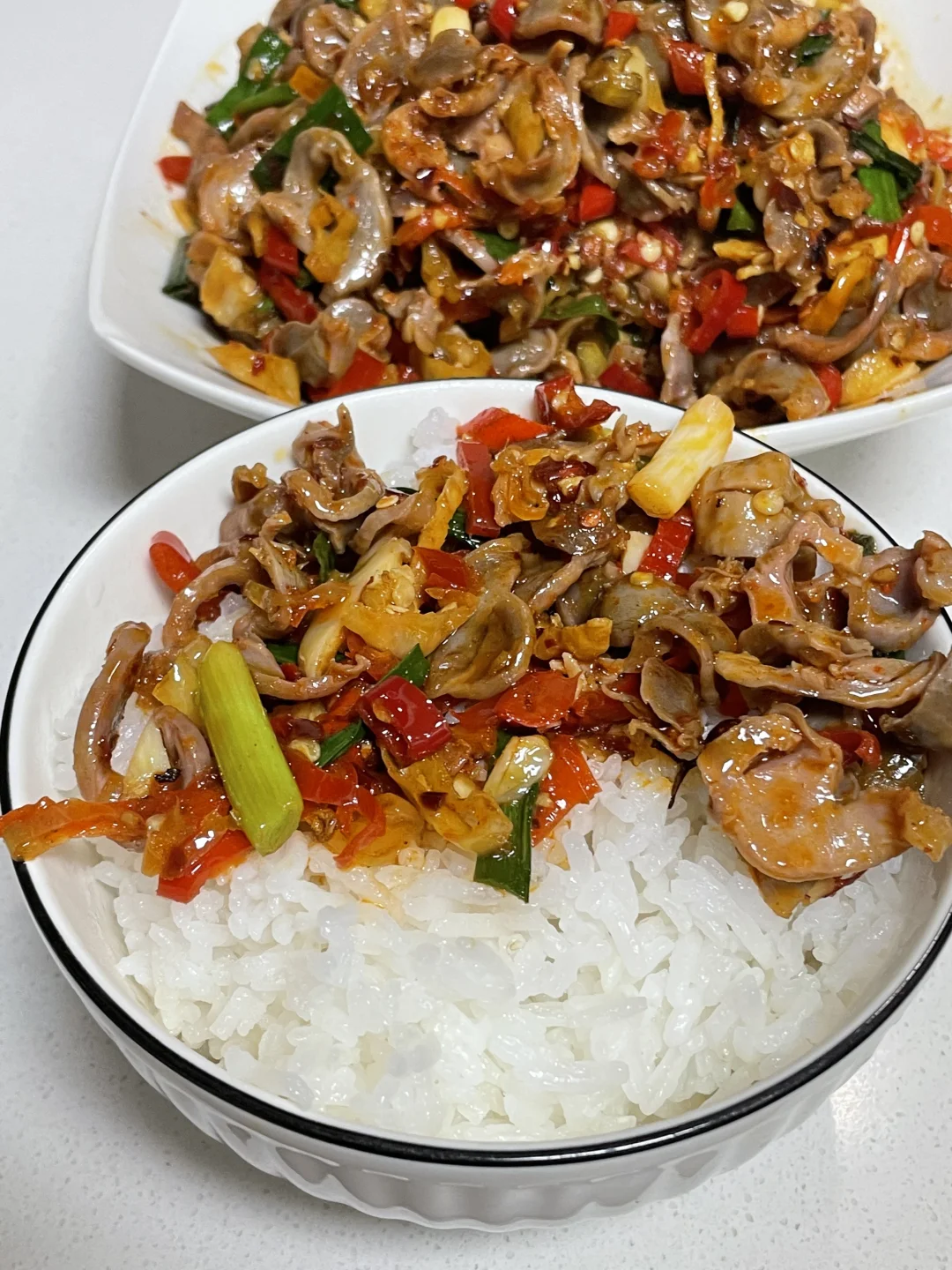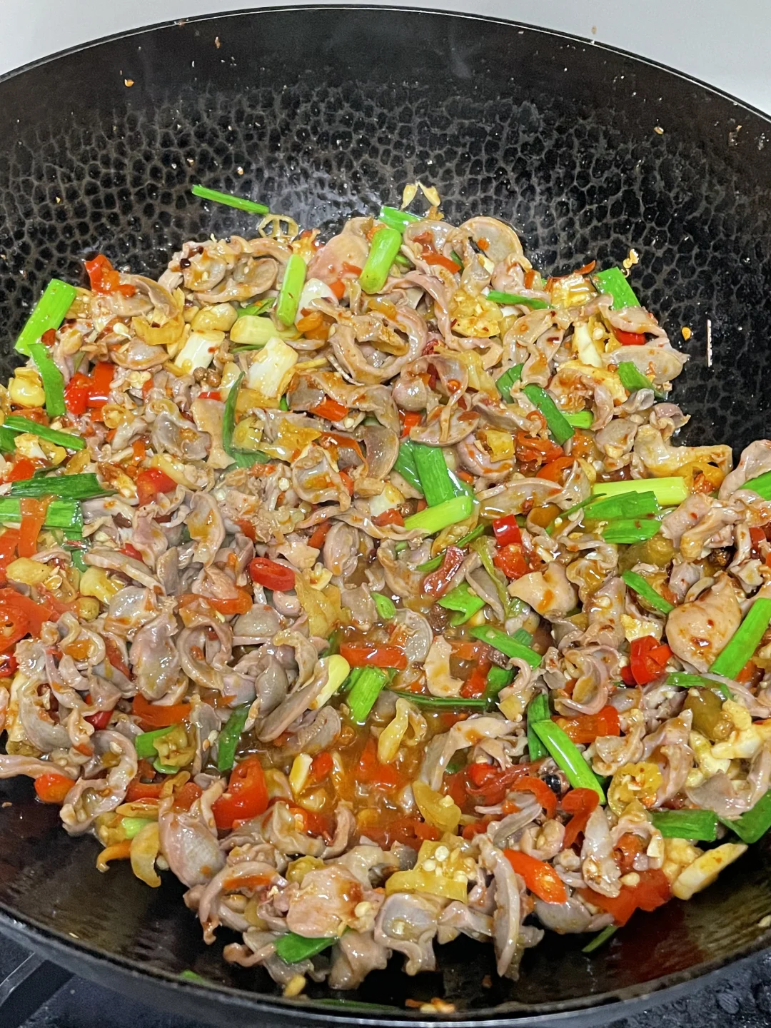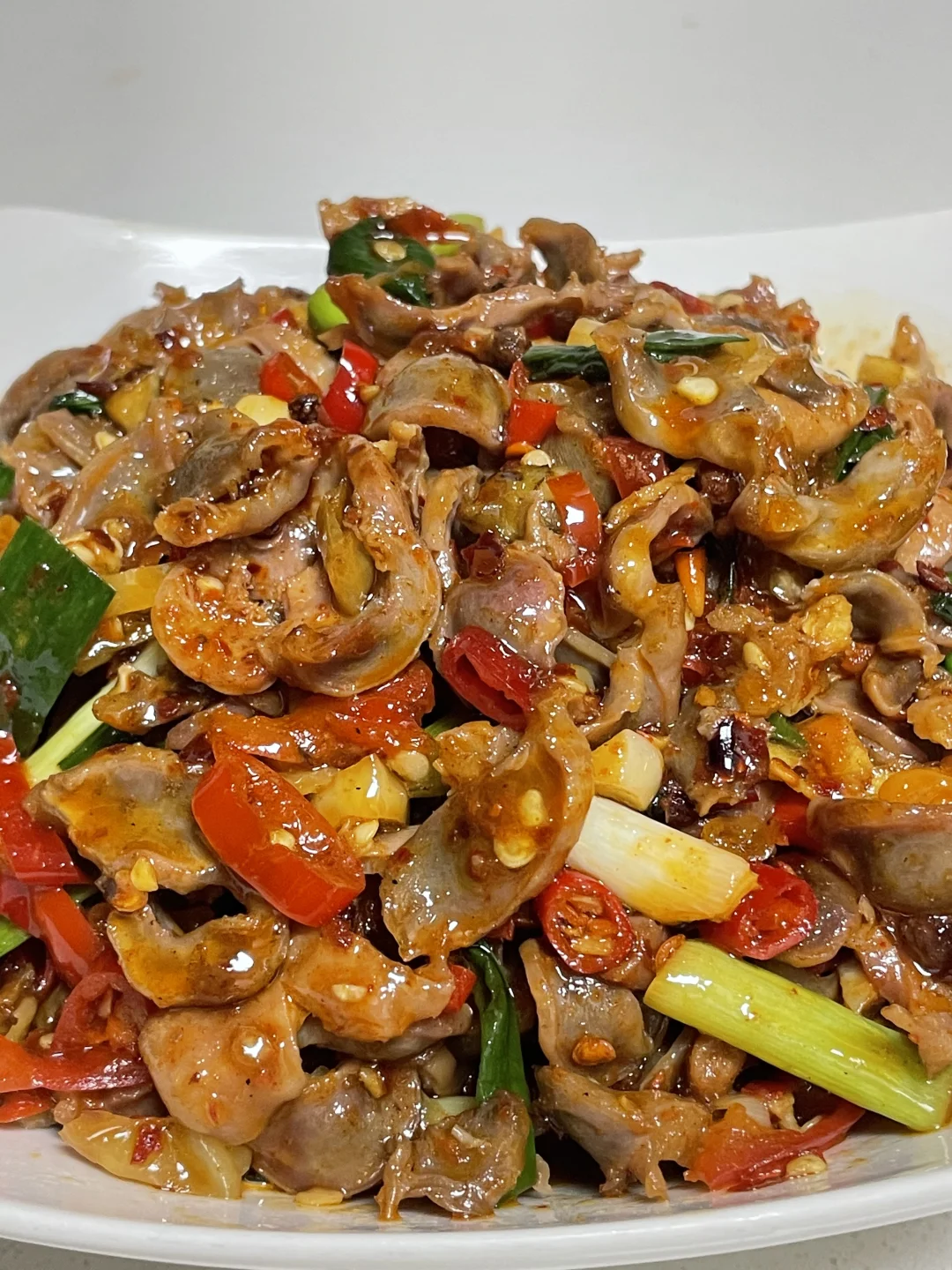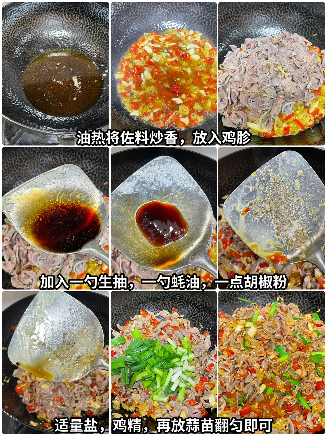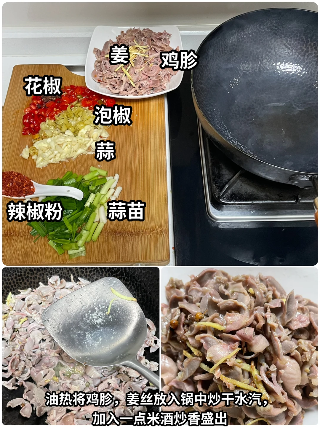 姐妹们,今天给大家出一个家庭小炒。泡椒鸡胗,这样做出来的鸡胗不会柴,也不会发硬。泡椒入味且巨下饭,喜欢的姐妹可以尝试着做一下。 🌶️食材:鸡胗,蒜苗,泡椒 👩‍🍳做法: 1⃣️鸡胗切片,放入盐、白醋抓两分钟,然后用清水洗净,控干水分备用。 2⃣️再切入一些姜丝备用。切多多的泡椒。蒜,再准备一些花椒,蒜苗切段,再来一勺辣椒粉 3⃣️起锅烧油,油热将鸡胗和准备的姜丝炒。炒干水汽,然后放入一点米酒炒香盛出。 4⃣️再放油,油热炒香泡椒、蒜、花椒,放入鸡胗,加入1勺生抽,1勺蚝油,1点胡椒粉、适量的盐和鸡精翻匀。再放入蒜苗辣椒粉拌匀即可出锅,这样做出来的泡椒酸辣鸡胗真的巨好吃,喜欢的姐妹试一试吧。