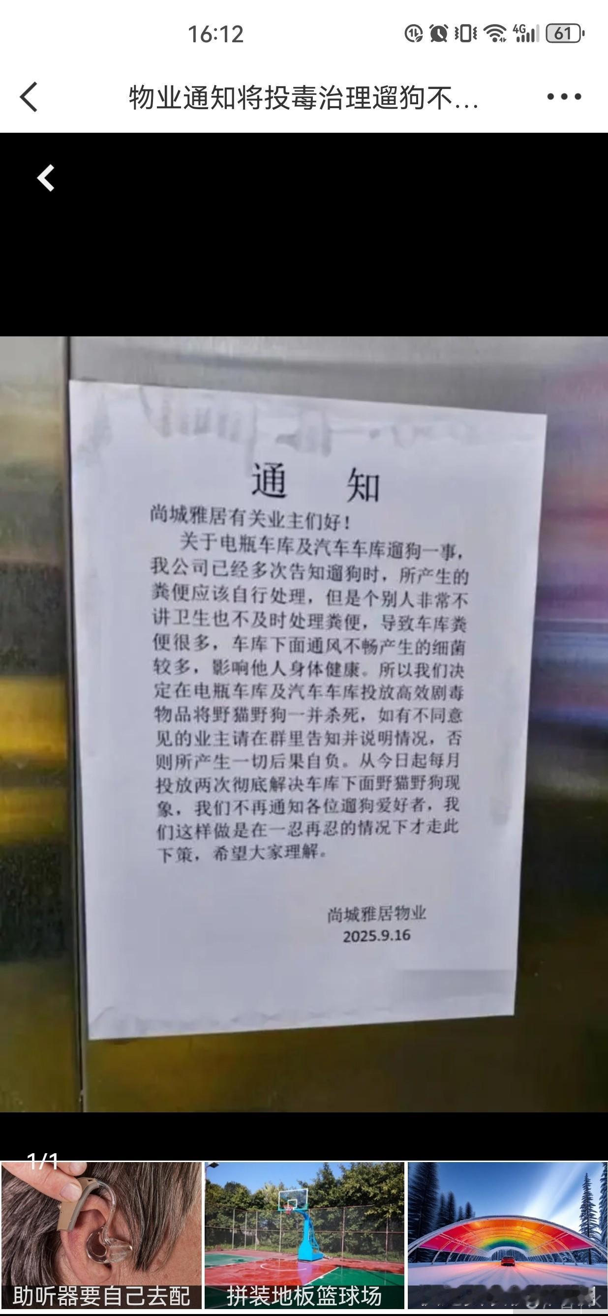 谁对谁错?物业为了治理遛狗不清粪便投药! 25年9月16日,江苏盐城尚城雅居物业发布通知,声称因地下车库遛狗不清理粪便现象严重,决定每月两次投放“高效剧毒物品”毒杀野猫野狗,并要求异议者主动说明,否则“后果自负”。通知用语强硬,引发住户对公共安全风险的担忧。后物业负责人于11月18日澄清:通知仅为“警示手段”,实际从未投放毒物。前期多次文明提醒无效,无奈出此下策,通知后不文明行为短期减少,但近期天气转冷问题复发,属地街道办表示若核实存在投毒行为将报警。 一种观点是即便未真正投毒,这样的警示可能构成对业主造成恐慌,涉嫌损害安全管理义务。物业的管理权不能超越法律,应采取正当方式劝导、处罚,而不能以危害公共安全作为“治理”手段。而另外一个观点是,地下车库内狗粪长期不清理易滋生细菌,狗尿会腐蚀车辆及轮胎。还有部分业主认为既然交了物业费清理责任就该由物业承担。 个人看来公共环境卫生,还是要靠大家一起动手来维护。少部分养宠人的不文明行为,遛狗不清理粪便、随意投喂流浪动物,忽视公共环境与他人权益,这才让物业想出极端警示手段。 物业作为小区管理方,面对治理难题,理应采取合法合规且人性化的方式。可以划定专门遛狗区域、联合社区对违规业主劝导惩戒等方法。靠“假投毒”这种打擦边球的警示方式,虽短期可能有效果,但并非长久之计。遛狗乱撒尿