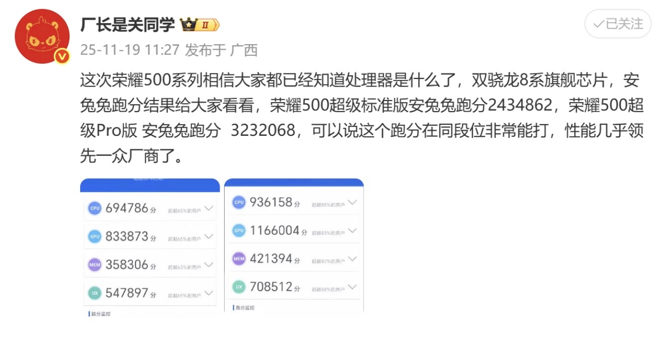 厂长已经放出了荣耀500和500Pro的跑分数据,荣耀500安兔兔跑分243万分,Pro更强,跑分超300万分,目前看应该是骁龙8至尊版,你就说这性能强不强?