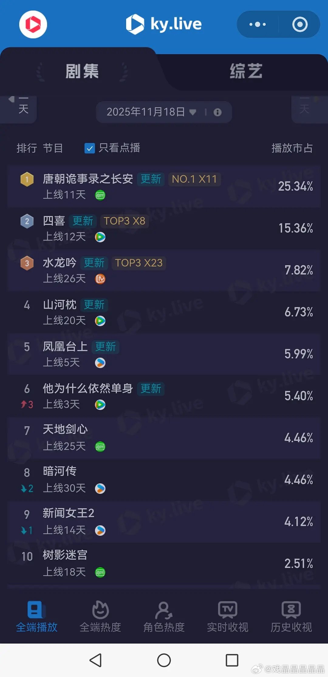 11.18酷云点播端 唐朝诡事录之长安25.34% 四喜15.36% 水龙吟7.82%11.18云合唐朝诡事录之长安27.7%、 四喜13.6%、山河枕6.4%、凤凰台上6.3%