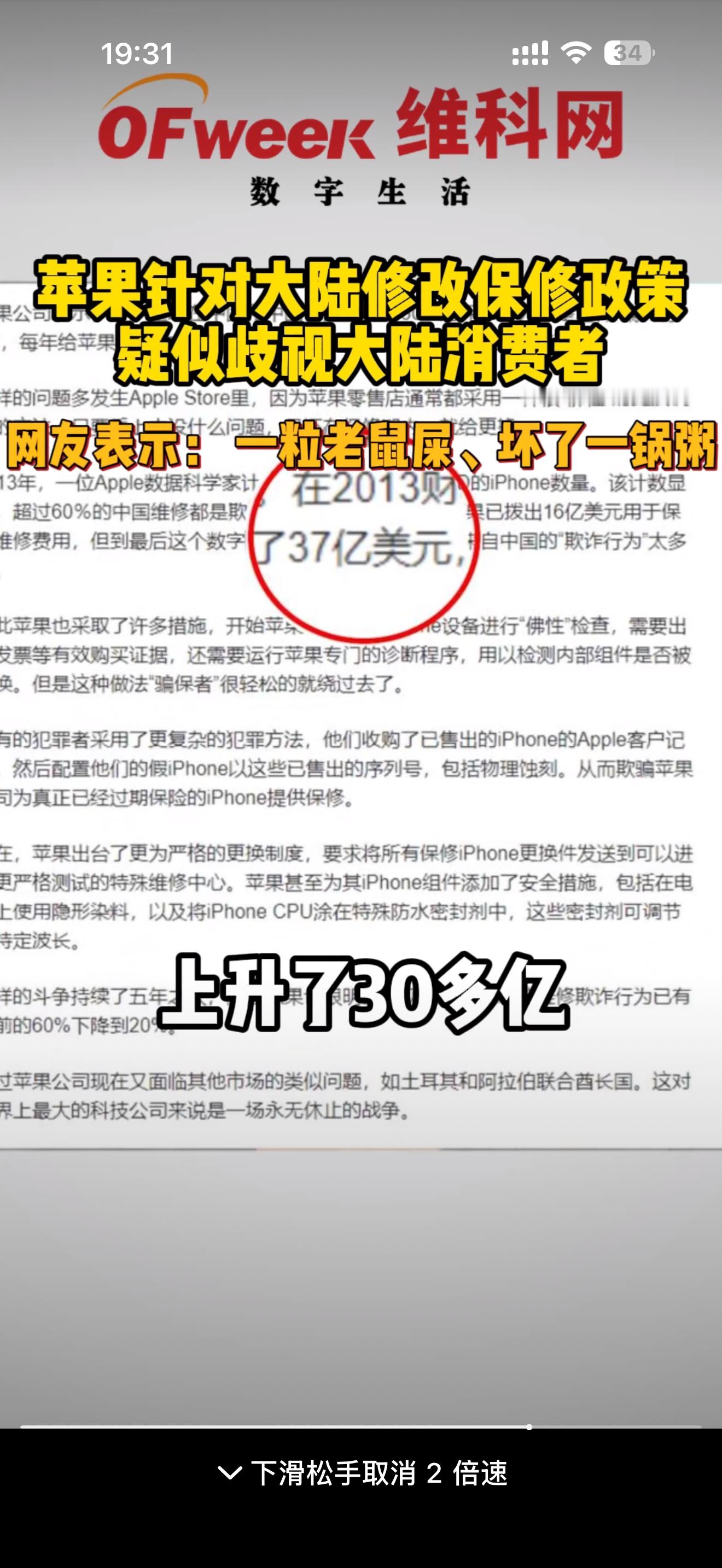 玩数码的应该都知道苹果在中国的保修政策,大概十年前,苹果的机子只要你保修期出了问题,都是给你免费换新,但是就有人利用这个漏洞,专门找苹果换新机。后面据说苹果统计了一下,光这项支出,苹果每年多出30几亿,还有人利用AC+,苹果售后一年亏损几十亿。所以苹果没办法,修改了只换不修的服务。而且你们知道吗?这个政策只在国内实行,最关键的是还有人居然做教程,薅苹果羊毛,只能说一颗老鼠屎,坏了一锅汤,我感觉以后电商平台也会这样改,别把Al用错了地方。