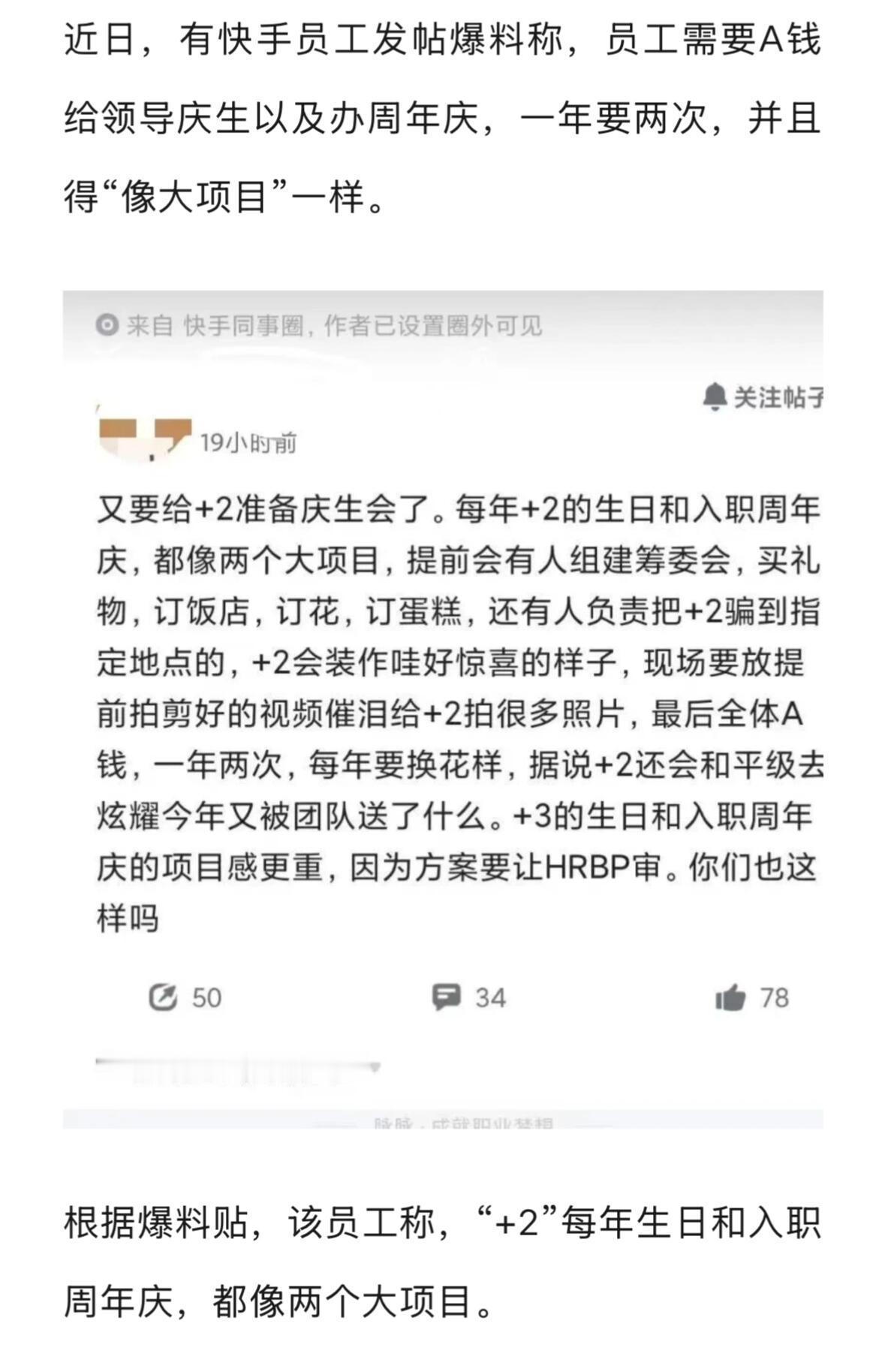 有快手员工发帖爆料称,其“+2”领导需要员工众筹A钱给办庆生和周年庆,一年要两次,并且得“像大项目”一样