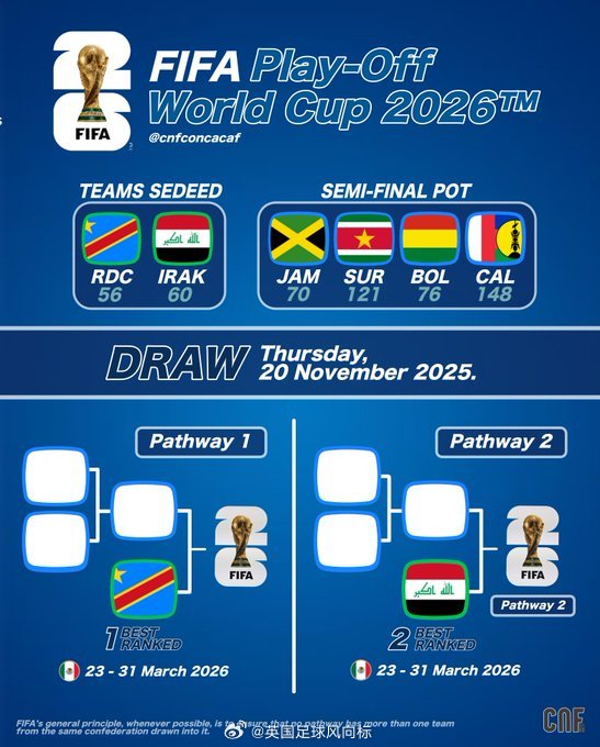 ,参加跨大洲附加赛的6支球队已经全部确认(括号内的数字是国际足联最新排名):非 洲:民主刚果(56)亚 洲:伊拉克(60)中北美及加勒比海区:牙买加(70)、苏里南(121)南美洲:玻利维亚(76)大洋洲:新喀里多尼亚(148)6队当中排名最高的两队,民主刚果(56)和伊拉克(60),自动分配到附加赛1区和2区,直接进入附加赛决赛。剩余的4队,将通过抽签分配到附加赛1区和2区,踢多一轮半决赛,附加赛1区和2区的最终冠军,获得世界杯入场券。PS:世界杯跨大洲附加赛,将于2026年3月,在中立场地墨西哥(瓜达拉哈拉和蒙特雷)。