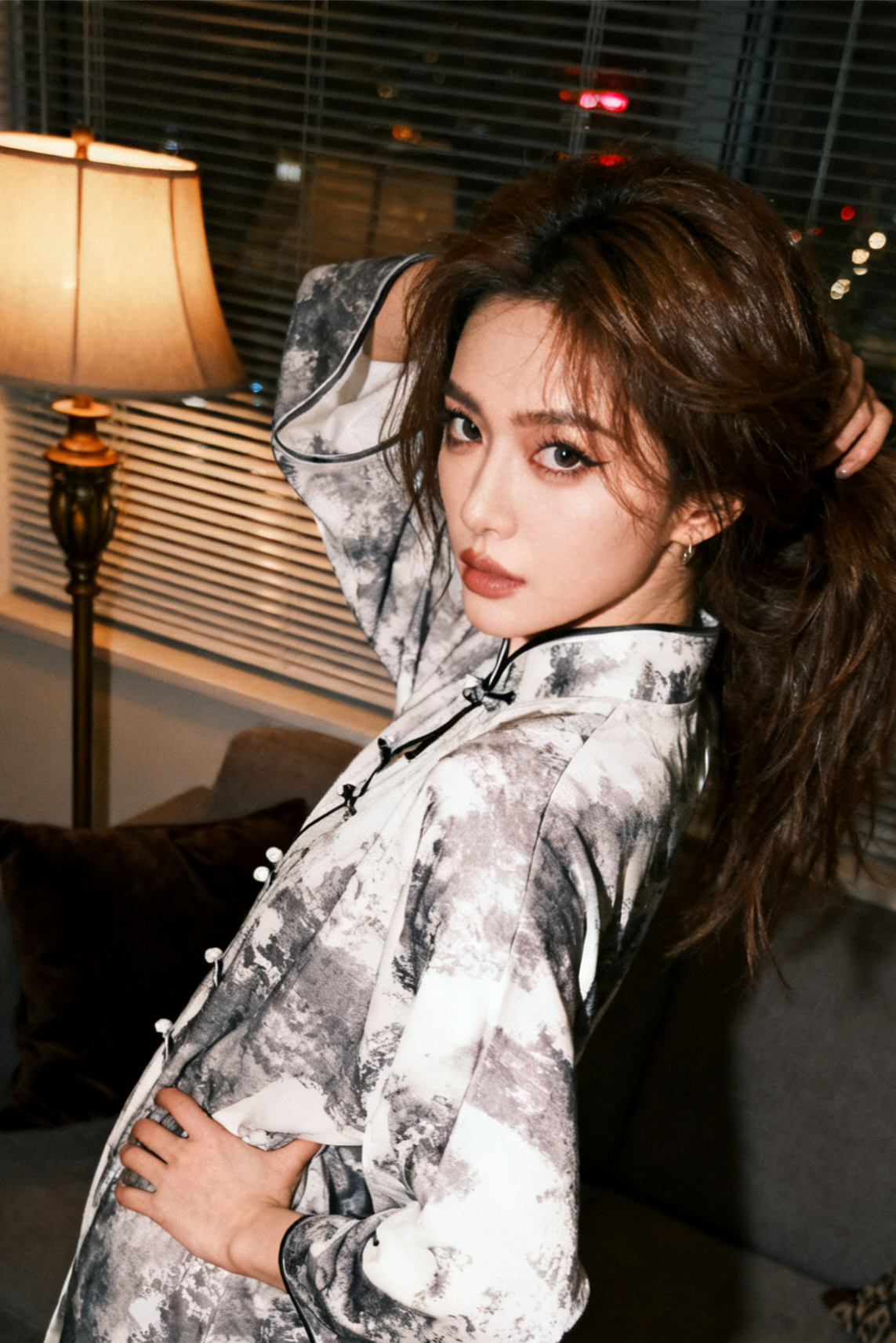 水墨晕染款新中式套装,在都市夜景与暖灯居境的映衬下,每一处盘扣细节都藏着东方松弛感。