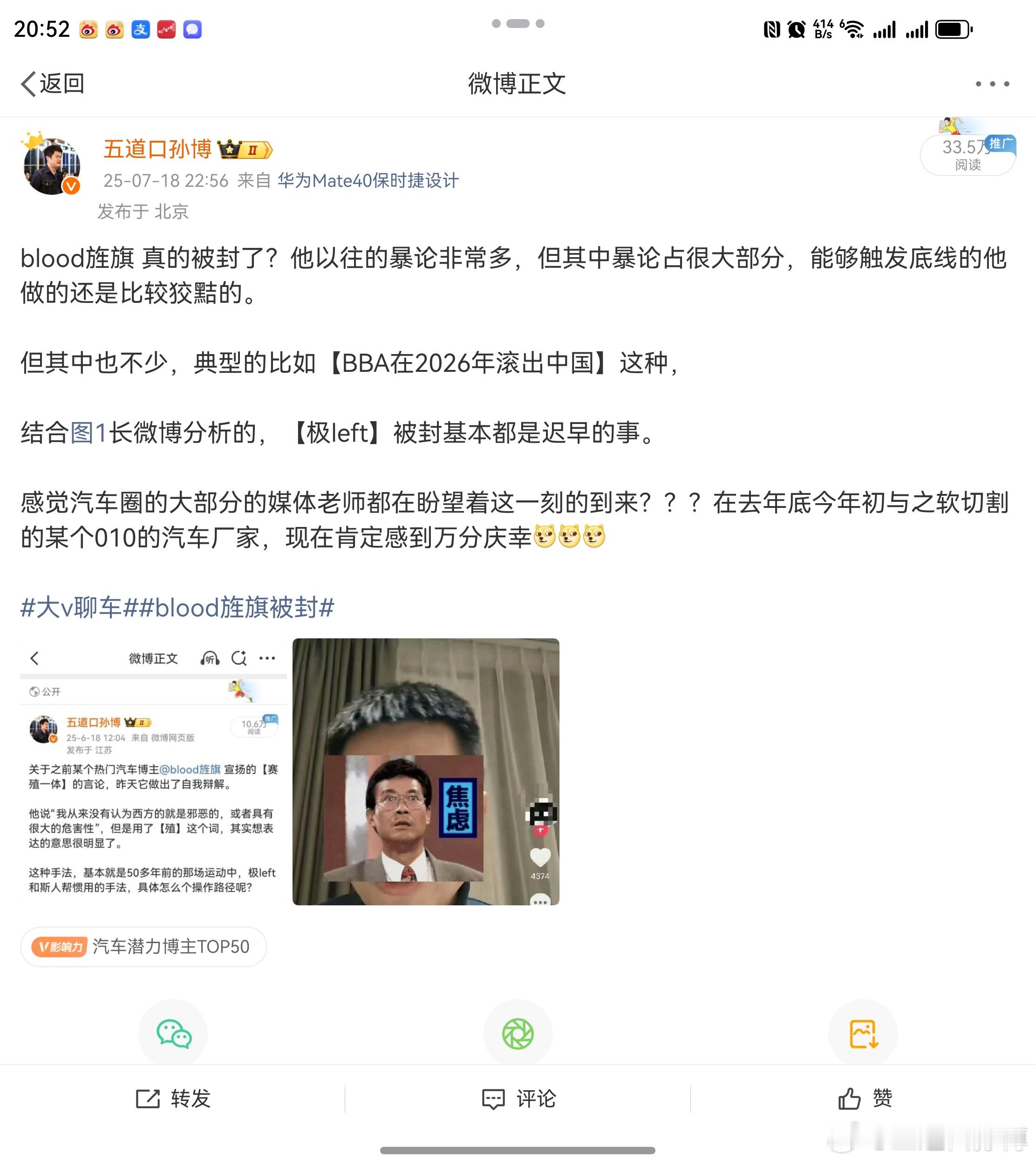 今年7月份, 被禁言过,当时都以为他被封了,结果是短暂禁言了几天,后来就被放了出来。但是这一次好像确实可能大概率是要被永封了。。。毕竟他的言论要比去年的小牛说车还极端,去年的小牛说车专门黑蔚来,而blood旌旗黑的车企,基本囊括了所有的合资车厂(图3是比较炸裂的)。另外有一点可以肯定的是,他的微博目前还能登录,因为他刚刚又把我拉黑了。