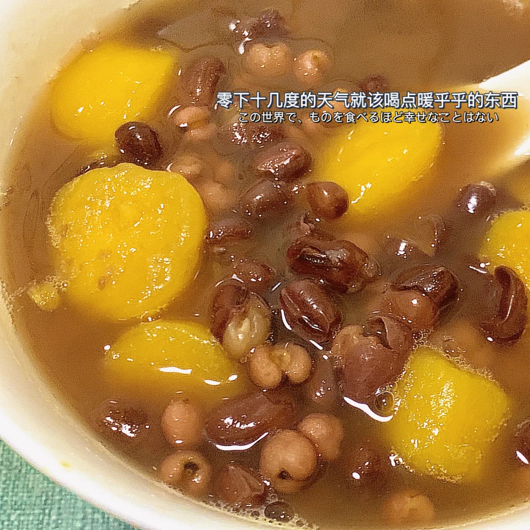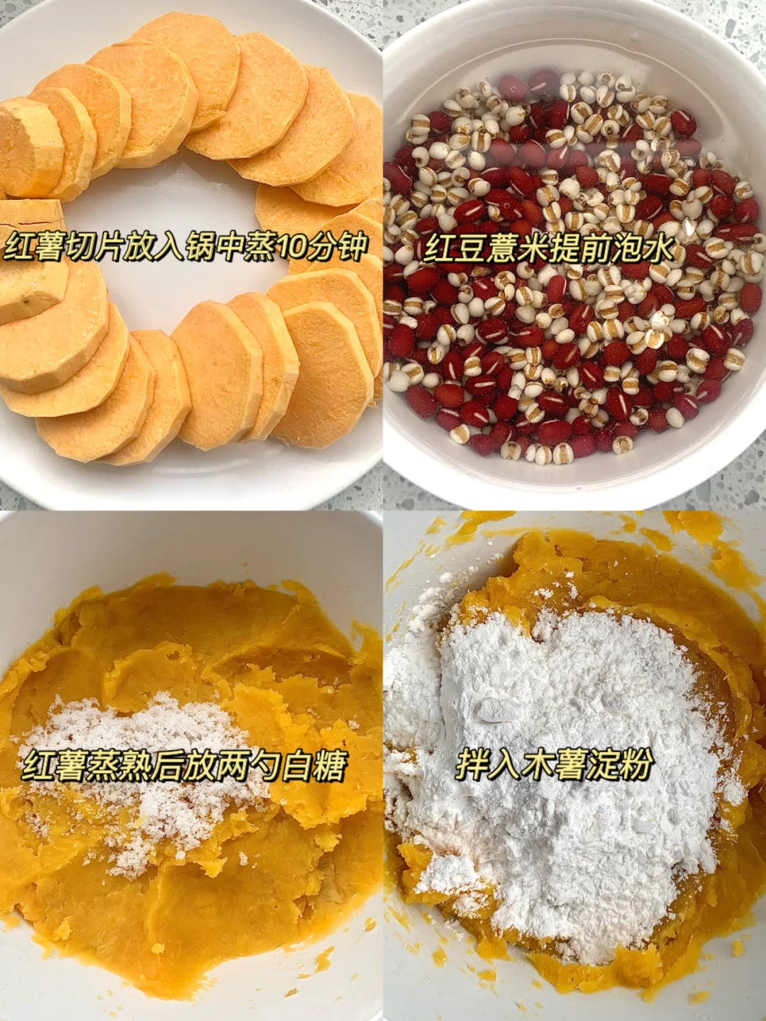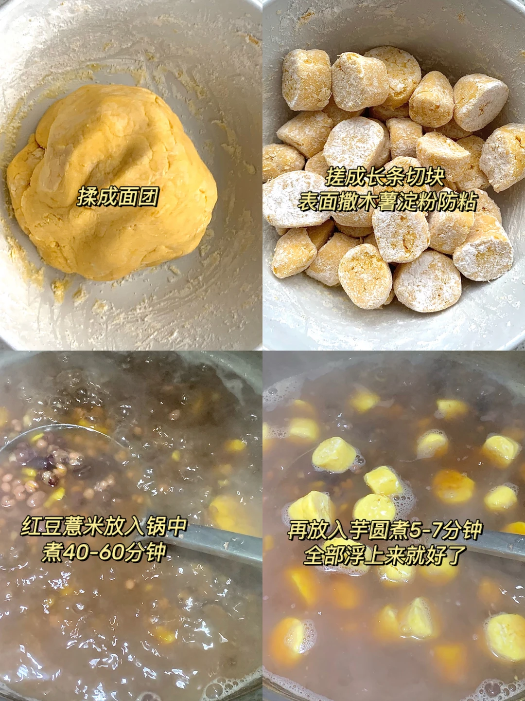 冬天不想出门,在家也能做出鲜芋仙好味道❣️自制的芋圆软糯Q弹,汤汤水水喝完暖乎乎的☕️ 食材篇🥬: 红薯、木薯淀粉、红豆、薏米 步骤篇🥣: 1、红薯切块备用,红豆薏米提前泡水备用 2、红薯上锅蒸10分钟至软烂,用勺子捣成泥加入白糖 3、拌入木薯淀粉揉至成团,搓成长条,用刀切成小段,撒上木薯淀粉防粘 4、红豆薏米放入锅中煮40-60分钟至软烂,接着放入芋圆煮5-7分钟至芋圆浮到汤面就完成了 ⚠️喜欢喝甜一点的可以放块红糖或冰糖 冬天一起在家DIY鲜芋仙红豆芋圆汤吧👭暖乎乎💛QQ弹🧡