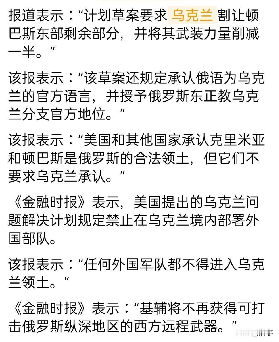 泽连斯基特大丑闻曝光!俄乌战争即将结束! 刚刚,国际媒体报道了一则出人意料之外的消息,美国预计本周将就乌克兰问题框架协议达成一致。该新闻内容显示 ,这次由美国推出的新版本停火协议是特朗普政府高层与俄罗斯政府秘密合作沟通的,整个过程都将乌克兰和欧洲排除在外。该协议不但要求乌克兰割让顿巴斯东部剩余地区,还要将乌克兰的现有武装力量削减一半(具体内容见附图二),条件比之前更加苛刻,完全倾向俄罗斯,但美国白宫代表却非常肯定的宣称,新版乌克兰问题框架协议将在本周达成一致。对此,美国方面给出的理由有两个。 一,俄罗斯在俄乌战场上已经取得压倒性优势,乌克兰难以翻盘。 二,泽连斯基特大丑闻曝光,乌克兰政府高层出现分裂,泽连斯基无法有效掌控乌克兰局势。所谓的泽连斯基特大丑闻,就是数日前震撼欧洲的乌克兰能源颔域贪墨案,有两位部长级人物与泽连斯基开公司的朋友卷入其中,其朋友在乌克兰相关部门调查他之前数小时前离开乌克兰,至今未归。对此,舆论普遍认为该事件的幕后主持者是泽连斯基和叶尔马克。该事件一经报道,欧洲多个国家表态,对继续支持这样的乌克兰表示怀疑。有消息指出,该丑闻正是美国透露出来以逼迫泽连斯基屈服,以达到美国迅速结束俄乌战争的目的。如果美国此次向泽连斯基施压成功,那么俄乌战争就即将结束,由此,美国政府就可以迅速整合美欧力量,实现其东进的目的。由此可见,曾有国际问题专家指出,乌克兰是东方的恩人,在某种程度上是对的,这就是国运加身的效果,相信仍会持续!