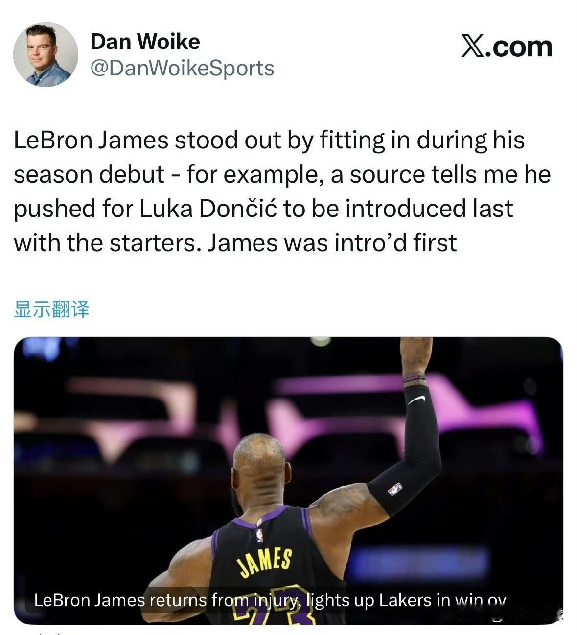 詹姆斯格局真大! 据湖人队跟队记者Dan Woike透露:昨天对阵爵士队的赛前出场环节,詹姆斯坚持要求东契奇在首发阵容介绍环节最后一个登场,而他自己则率先被介绍入场。 这体现了刚刚复出的詹姆斯的大格局,他用实际行动来告诉东契奇“这是你的球队”。一般来说,球员介绍环节最后一个登场的都是球队当家球星,之前一直是詹姆斯,本赛季主动让贤,这不失为一段佳话。毫无疑问,现在的这支湖人队是东契奇的球队,詹姆斯心里也非常清楚的明白这一点。