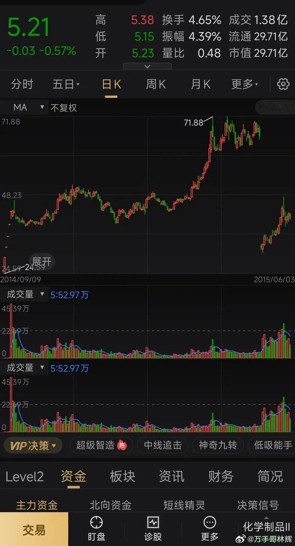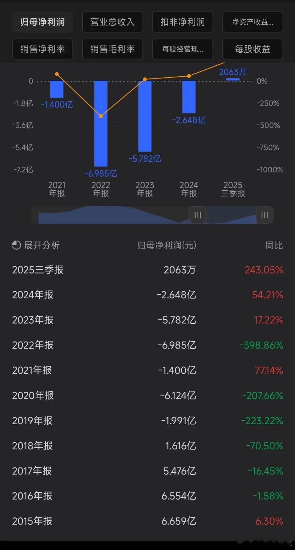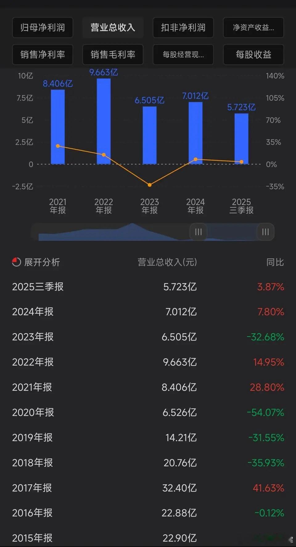 发行价20.49元的它,巅峰时涨到了71.88元,11年过去了,如今它的股价只剩下5.21元,较高点跌去92.75%。这是一个上市了11年多的公司,2014年9月9日它成功在上交所主板上市了,发行价20.49元的它上市后连续5个交易日涨停,在后面的半年时间涨到了71.88元,而它目前的股价只剩下5.21元,较发行价已经跌去了74.57%,即便是复权后的股价也不过是13.52元,离发行价依然有34.02%的跌幅。该股股价为何在短短的十年时间从71.88元跌到如今的5.21元?这一切的根源源于它业绩的暴跌,上市当年它的营业收入是23.14亿元、净利润是6.265亿元。营收在2017年达到32.40亿元后便开始快速回落,到了今年三季度只剩下5.723亿元;净利润下降就更严重了,在2015年达到6.659亿元后就开始暴跌,2019年已经出现-1.991亿元亏损了,亏损持续了六年,直到今年才扭亏为盈,六年的亏损总额高达24.93亿元,而它自上市以来的总利润还不到27亿元,也就是说上市11年多只赚了不到2亿元的净利润。虽然现在该股的股价只有5.21元,但是相比去年2月8日1.84元的股价已经上涨了183.15%,对于这种从高位跌下来加上业绩差的个股,在座的各位有什么独到见解呢?欢迎在评论区分享一下您的看法!