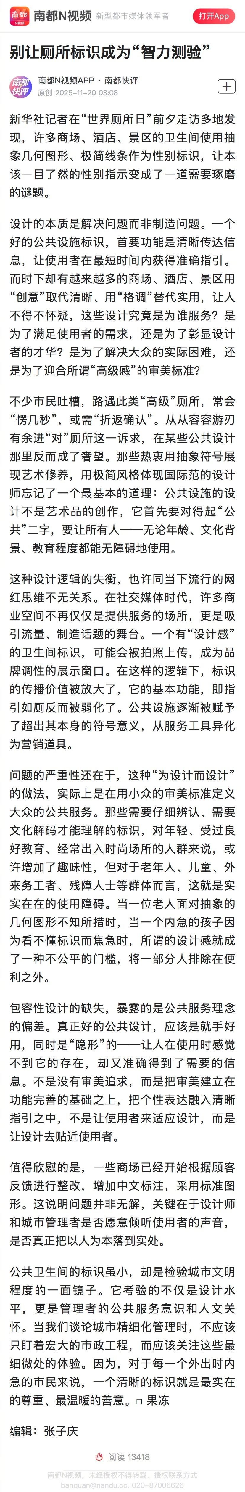 【南都快评:别让厕所标识成为“智力测验”】 新华社记者在“世界厕所日”前夕走访多地发现,许多商场、酒店、景区的卫生间使用抽象几何图形、极简线条作为性别标识,让本该一目了然的性别指示变成了一道需要琢磨的谜题。设计的本质是解决问题而非制造问题。一个好的公共设施标识,首要功能是清晰传达信息,让使用者在最短时间内获得准确指引。而时下却有越来越多的商场、酒店、景区用“创意”取代清晰、用“格调”替代实用,让人不得不怀疑,这些设计究竟是为谁服务?是为了满足使用者的需求,还是为了彰显设计者的才华?是为了解决大众的实际困难,还是为了迎合所谓“高级感”的审美标准?那些热衷用抽象符号展现艺术修养,用极简风格体现国际范的设计师忘记了一个最基本的道理:公共设施的设计不是艺术品的创作,它首先要对得起“公共”二字,要让所有人——无论年龄、文化背景、教育程度都能无障碍地使用。问题的严重性还在于,这种“为设计而设计”的做法,实际上是在用小众的审美标准定义大众的公共服务。那些需要仔细辨认、需要文化解码才能理解的标识,对年轻、受过良好教育、经常出入时尚场所的人群来说,或许增加了趣味性,但对于老年人、儿童、外来务工者、残障人士等群体而言,这就是实实在在的使用障碍……所谓的设计感就成了一种不公平的门槛,将一部分人排除在便利之外。