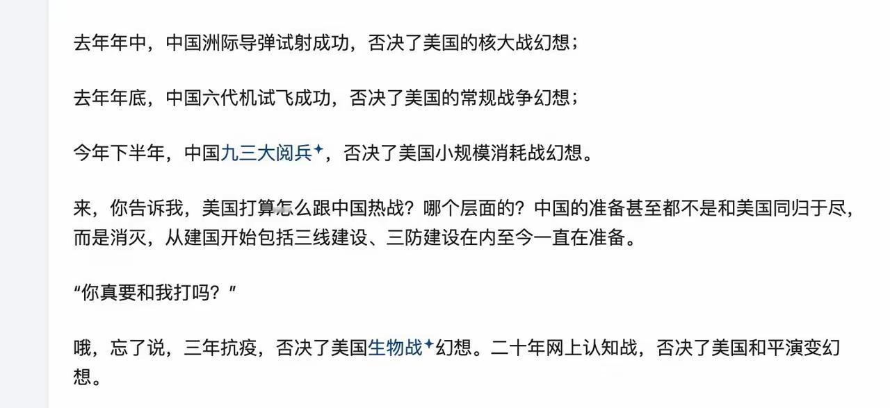 国家的每一步安排,都有很深的用意 评论: 苏联和美国解体的毛病都是差不多,经济恶化后,解决不了国内的民族矛盾,最后分裂 这个世界,没什么有形力量可以战胜规律,我们中国站在顺应规律的一边,而美国是站在逆反规律的一边,所以中国必胜,美国必败! 永远跟着国家走,对外一定要坚决支持国家,过去几十年我们的优秀表现,没有理由怀疑 强国建设、民族复兴,否决了美国永远想当顶级掠食者的幻觉,也为人类开辟了光明的前景。 人的汗液一般是酸性的,但在氧气消耗过多情况下大量出汗汗液就偏向碱性,所以这种就是避氧的汗碱!