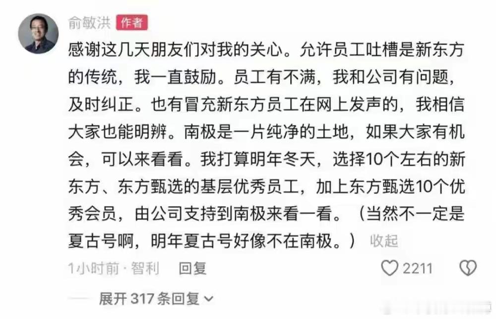 俞敏洪首次回应“在南极发全员信被员工吐槽”:明年将选10个左右员工去南极,否认邮