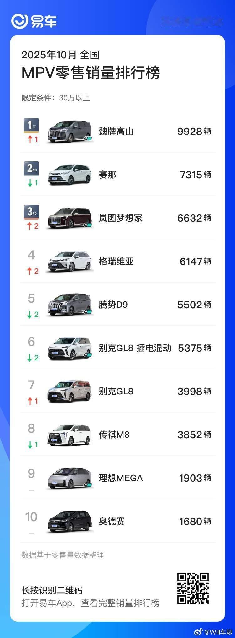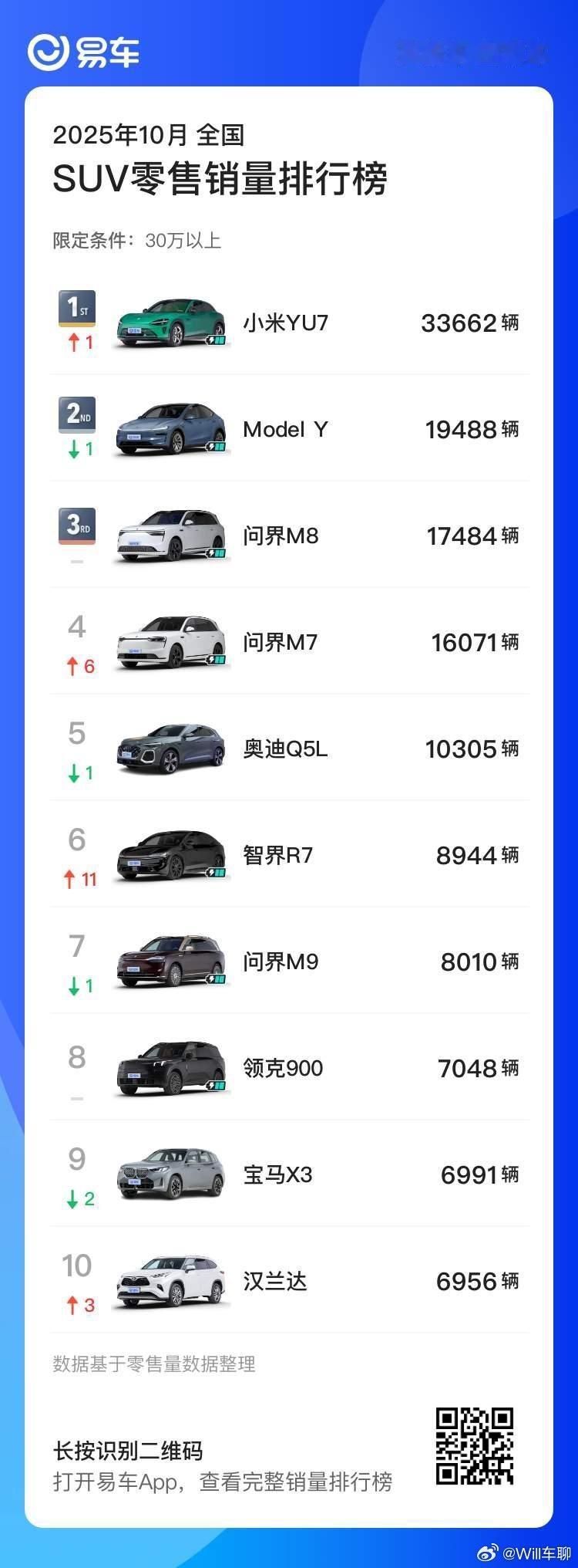 易车的10月份排行榜,30万以上的MPV,魏牌高山第一。腾势D9排在第五位,说明腾势的D9的车型,入门版卖得好。而小鹏X9的,都进不了前十。…………………………………………………………………………30万以上的SUV,小米YU7卖了33662辆,是Model Y的接近一倍(图2)。那么小米SU7在上个月卖了一万辆左右,而联想到小米SU7的交付周期现在缩短到一个月左右……那么小米SU7锁单池的确是真空了。现在发易车的榜单,都觉得易车会不会又会被封了…… 之前易车发的榜单,就被批评说挑起各个车企的竞争,加剧品牌之间的内卷,引发焦虑……