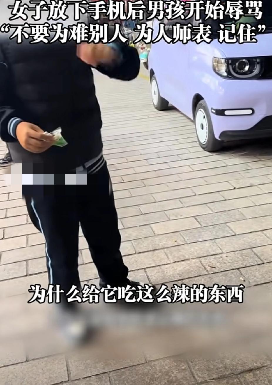 11月19日,山东一女子遛狗间隙去便利店买水,小狗被一男孩喂泡椒,女子接连质问,小男孩临走一句话:“不要再为难别人,你为人师表,记住!” 女子发现男孩给自己的小狗喂泡椒时问男孩:“你觉得这泡椒辣吗?” 男孩后退半步:“啊?不辣吧。” 女子接着问:“你觉得不辣你就喂给它吃是吗?你小时候有人给你吃泡椒吗?你这样对吗?” 男孩说:“不对。” 看到男孩承认错误,女子没再继续追究。男孩转身离开,说:“希望你不要再为难别人。” 女子简直不敢相信自己的耳朵,于是对着骑自行车离开的男孩喊:“你说什么,你再说一遍!” “不要再为难别人,你为人师表,希望你记住!”男孩的声音响彻整条街道。 女子气不过,接着嘲男孩喊:“那你凭什么喂我狗吃泡椒?” 男孩骑车离开了,没有再回应。 女子觉得很委屈,明明是男孩先给自己的狗喂了泡椒,怎么最后还成了自己有问题。对此,你怎么看呢?到底孰是孰非呢? 泡椒喂狗