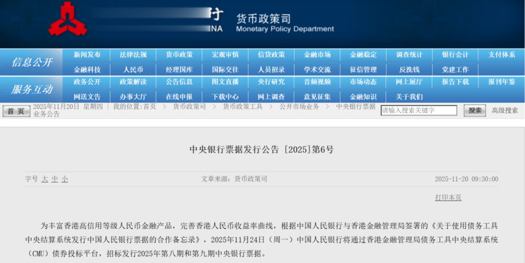 11月20日,中国人民银行官网发布中央银行票据发行公告〔2025〕6号。公告显示,中国人民银行11月24日将在香港招标发行450亿元两期中央银行票据。