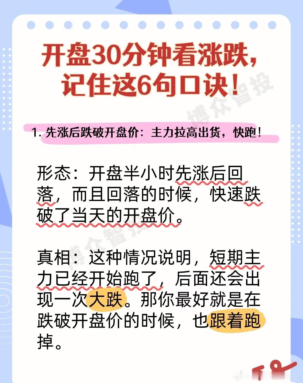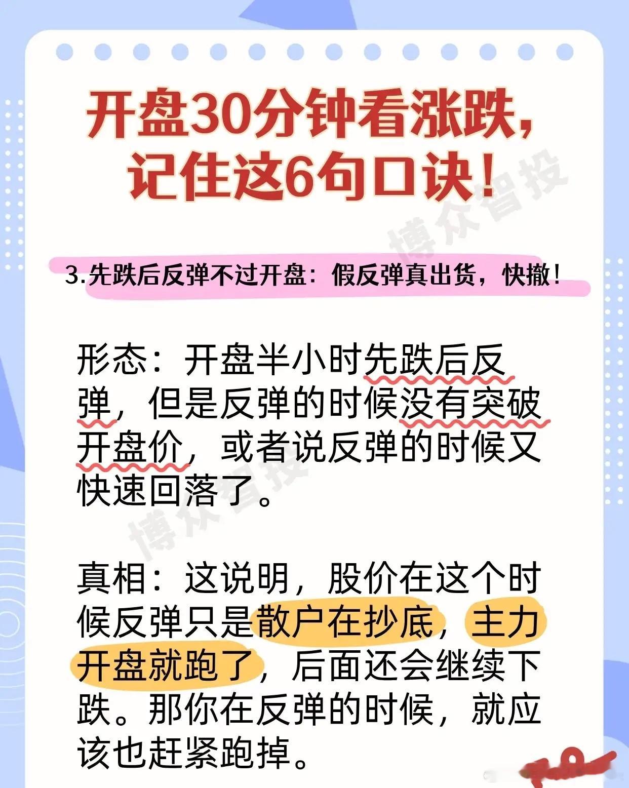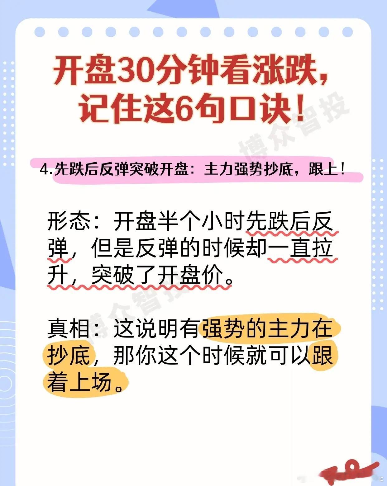 以下是6句开盘30分钟看涨跌口诀的极简总结:1. 先涨后破开盘价 → 主力出货,快跑!2. 先涨后跌不破开盘 → 洗盘,主力还在,下午或拉升。3. 先跌后反弹不过开盘 → 假反弹,主力已跑,速撤!4. 先跌后反弹突破开盘 → 主力强势抄底,可跟进。5. 小幅拉升后高位震荡 → 主力可能有大动作,盯紧!6. 全程窄幅震荡 → 无主力,观望别动。核心逻辑:开盘30分钟走势定主力意图,跟对信号操作!