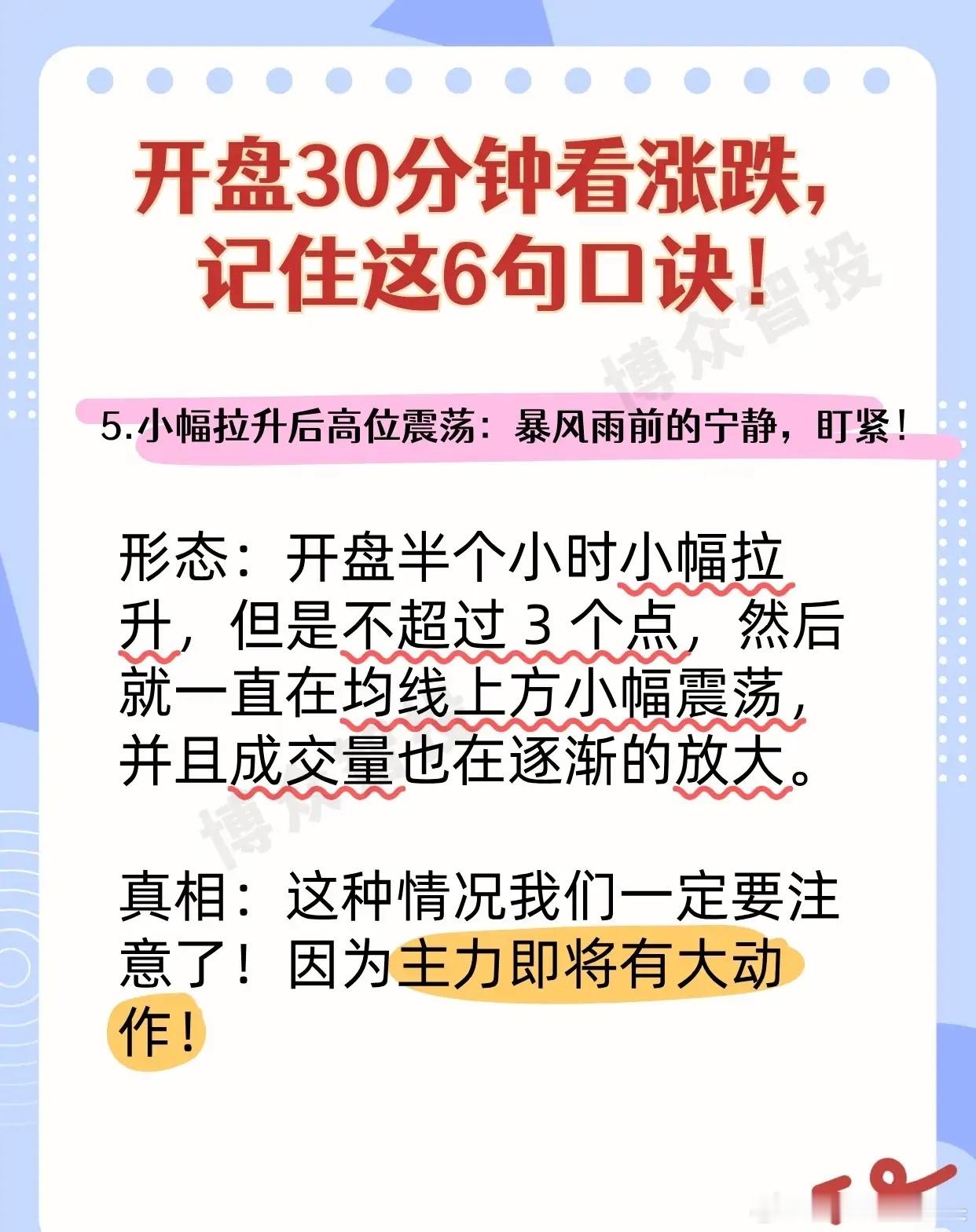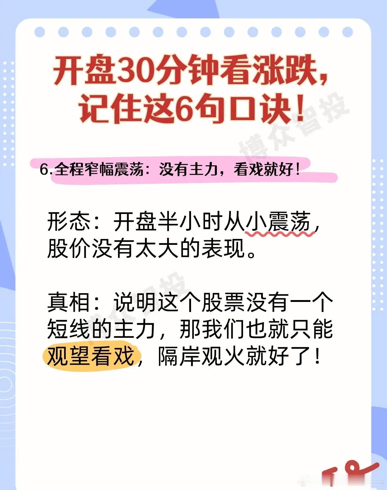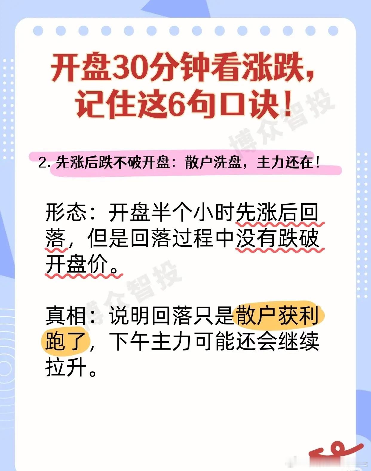 以下是6句开盘30分钟看涨跌口诀的极简总结:1. 先涨后破开盘价 → 主力出货,快跑!2. 先涨后跌不破开盘 → 洗盘,主力还在,下午或拉升。3. 先跌后反弹不过开盘 → 假反弹,主力已跑,速撤!4. 先跌后反弹突破开盘 → 主力强势抄底,可跟进。5. 小幅拉升后高位震荡 → 主力可能有大动作,盯紧!6. 全程窄幅震荡 → 无主力,观望别动。核心逻辑:开盘30分钟走势定主力意图,跟对信号操作!