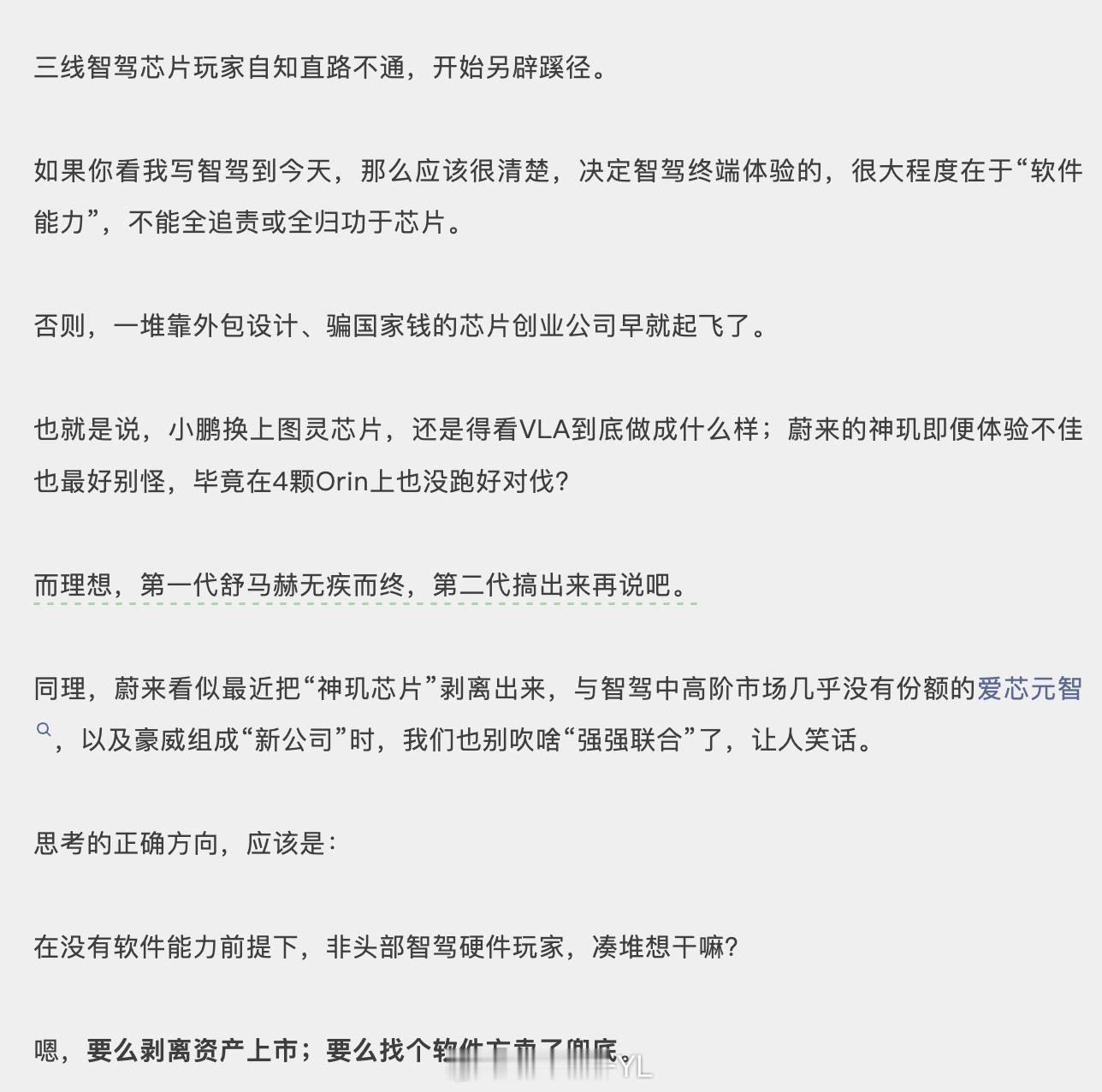 昨天蔚来的辅助驾驶芯片的外发,引来宇大姐的一顿嘲讽。我是这么看的:蔚来把自研辅助智驾芯片——神玑 NX9031,对外开放授权,是追求规模效应。蔚来的现实压力摆在那儿,每个单元都在算投入产出比,算经营的效益。25 年中国汽车行业都在推进芯片自主化,新能源车企又都在冲 Q4 盈利,自研芯片也需要追求规模效应,否则呢成本下不来,规模也上不去。蔚来选择把 NX9031 拿出来,可以降低自研摊销,把账算清;也是通过“合资+授权”,让这些人放到产业链上去,把量做大,保证供应稳定。从格局看,行业主流方案各有利弊:英伟达强但贵、还有政策风险;华为强但封闭;地平线灵活但生态相对替换起来不容易,车企都希望掌握方向盘,芯片路线上多种选择,最好还是有人扫过雷的。 蔚来还是懂车企的痛点的,自由度、确定性和可控成本。这次开放授权也是让芯片公司往前走走,反正蔚来是放权了。其实今年压力是传递到每个汽车行业的玩家的,不止是理想和小米。