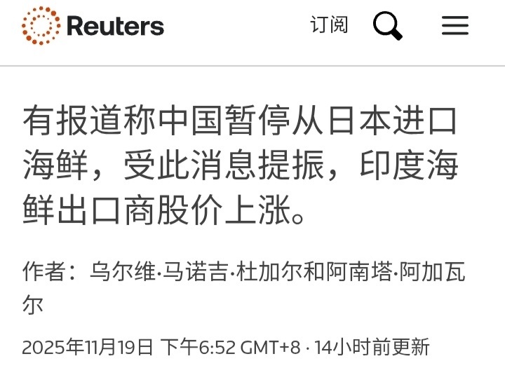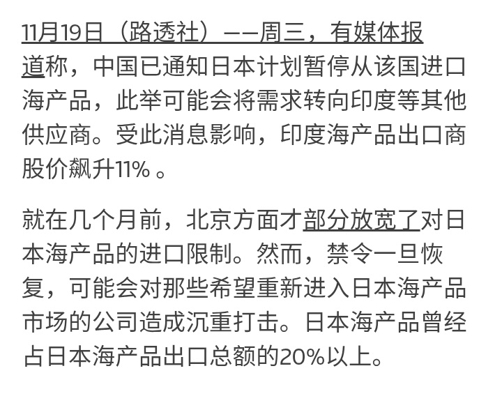 路透社:周三(19日),中国通知日本计划暂停从该国进口海产品,此举可能会将需求转向印度等其他供应商。受此消息影响,印度海产品出口商股价飙升11%。