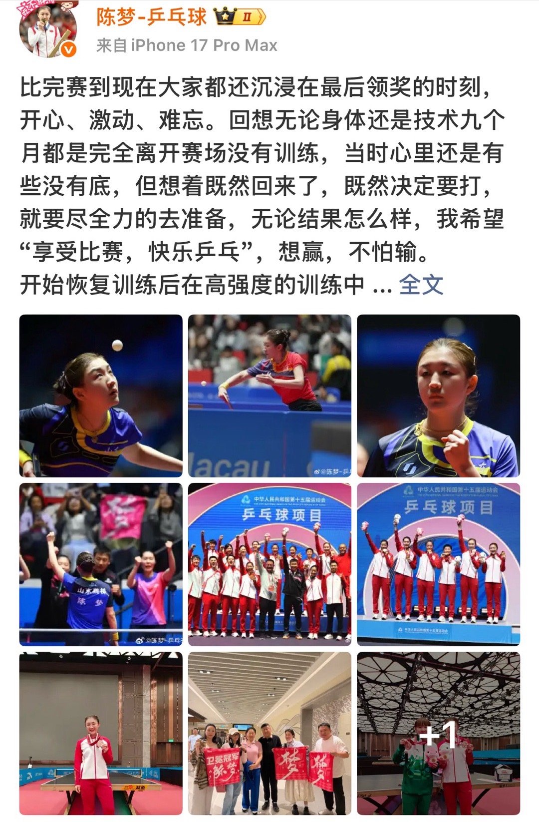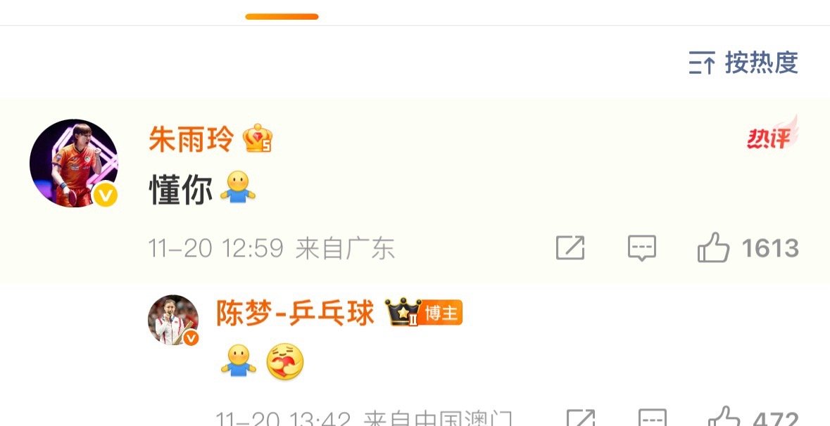 陈梦发长文总结全运会,朱雨玲和陈梦在评论区互动。朱雨玲:懂你陈梦: